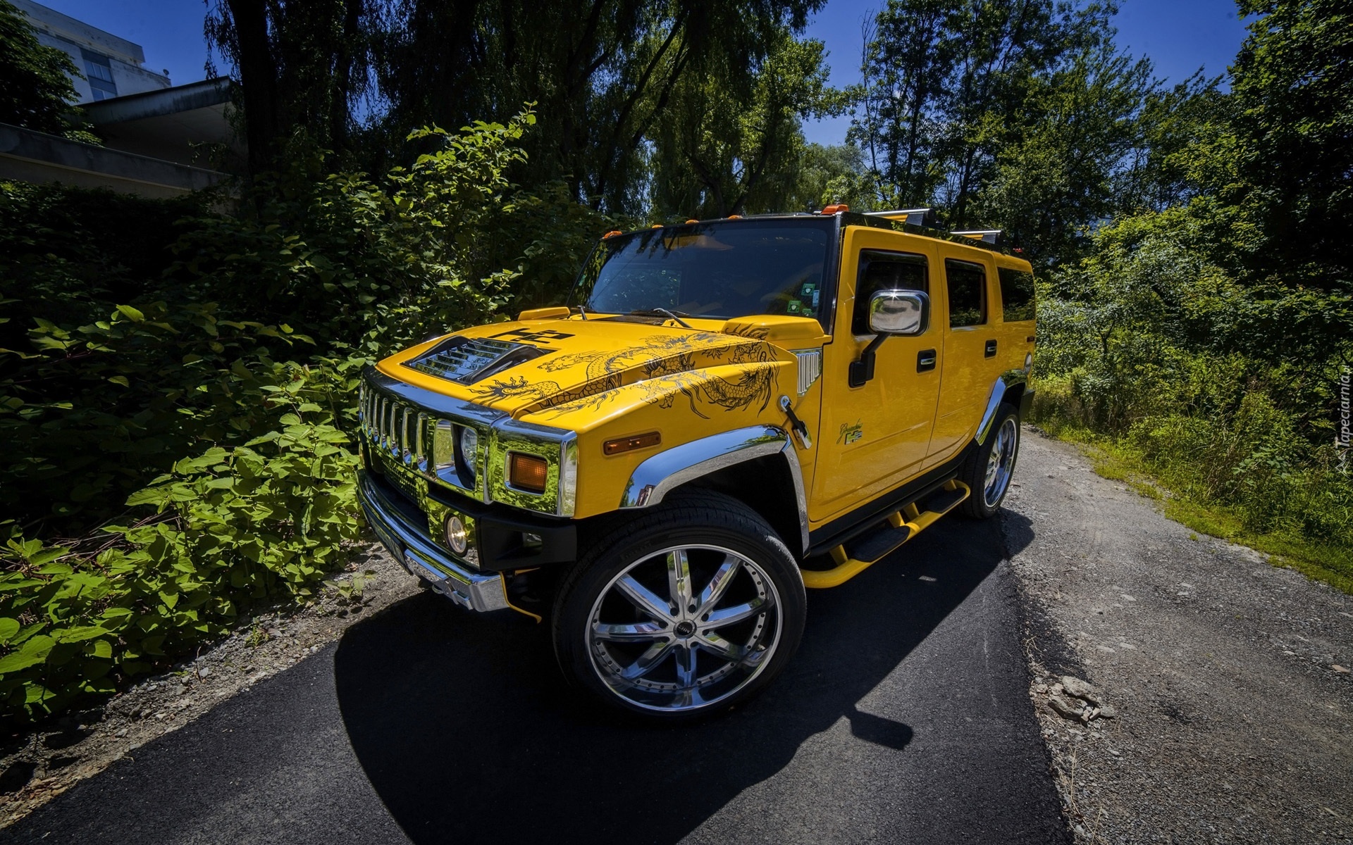 Edytor tapety: Żółty Hummer H2, Droga, Drzewa