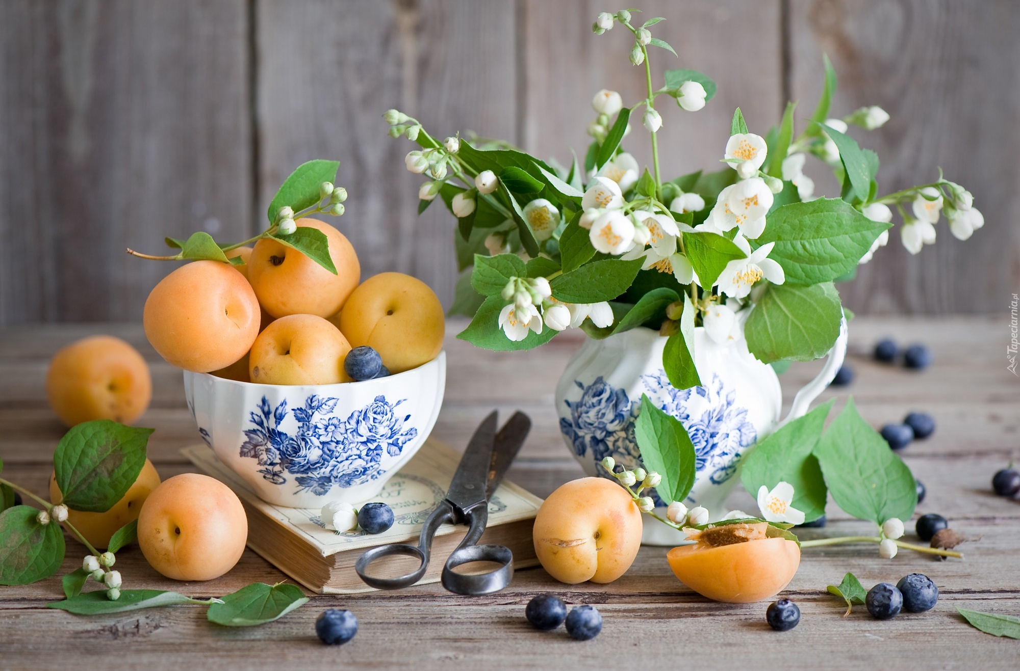 Edytor tapety: Kwiaty, Jasmin, Owoce, Morele, Kompozycja