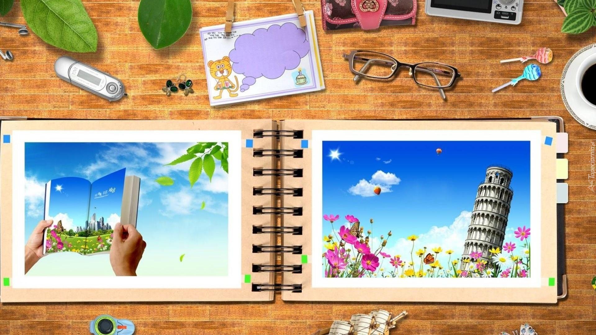 Edytor tapety: Grafika, Komputerowa, Zeszyt, Okulary, Liście