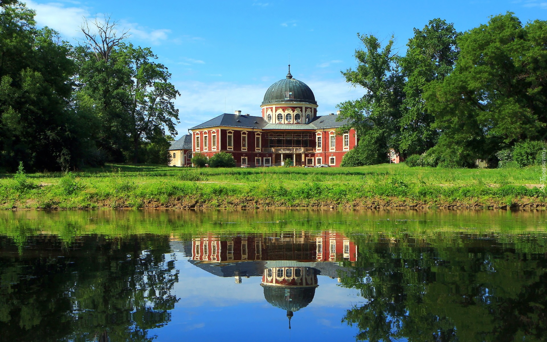 Edytor tapety: Park, Budowla, Kopuła, Jeziorko, Staw, Drzewa, Odbicie
