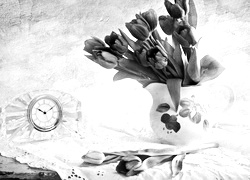 Edytor tapety: Fioletowe, Tulipany, Bukiet, Dzbanuszek, Zegarek
