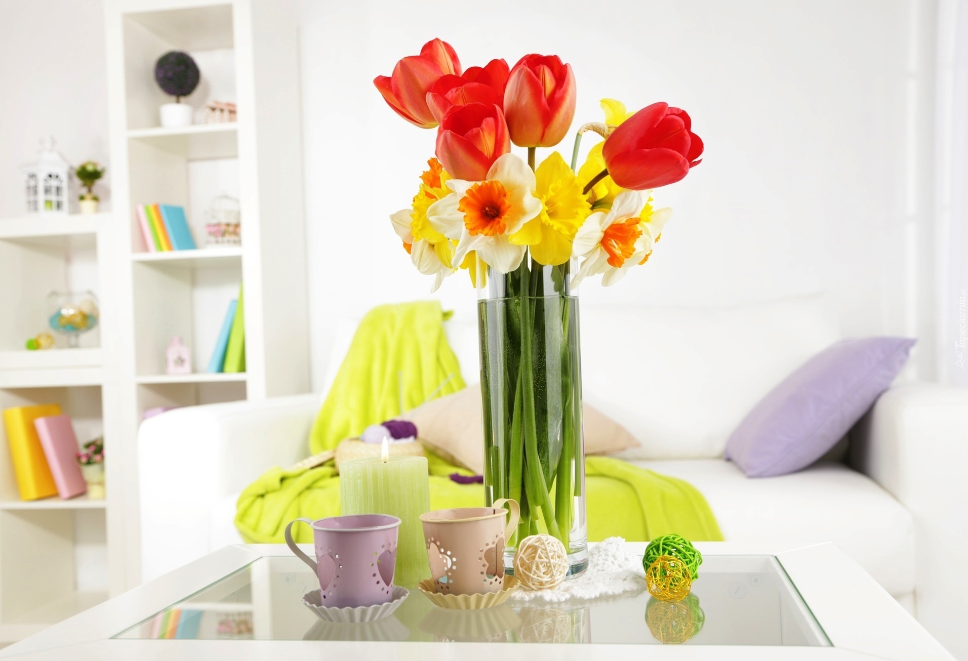 Edytor tapety: Wnętrze, Pokój, Stół, Tulipany, Żonkile, Bukiet