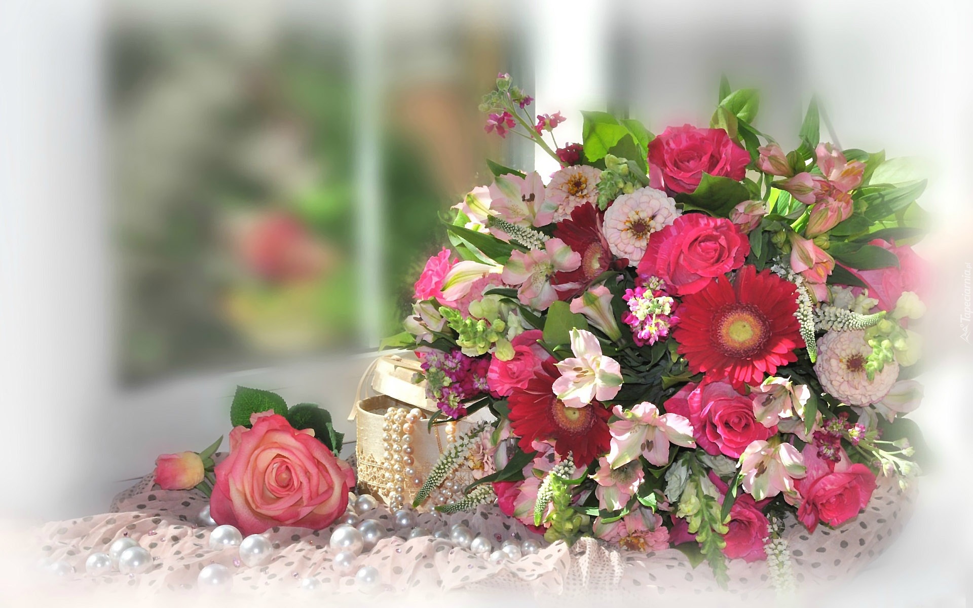 Edytor tapety: Bukiet, Alstremeria, Gerbera, Róże, Biżuteria, Perły
