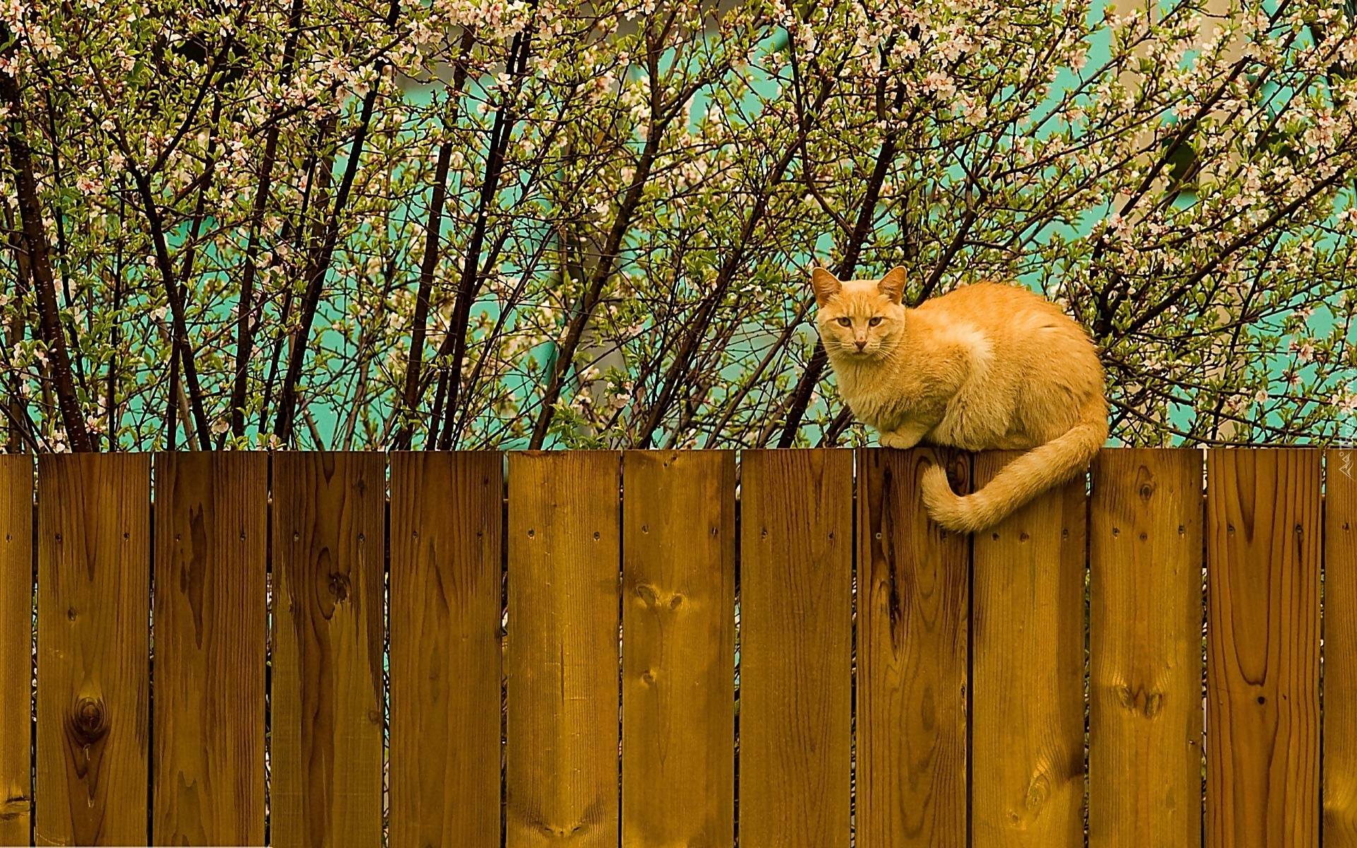 Edytor tapety: Rudy, Kot, Płot, Kwitnące, Gałązki