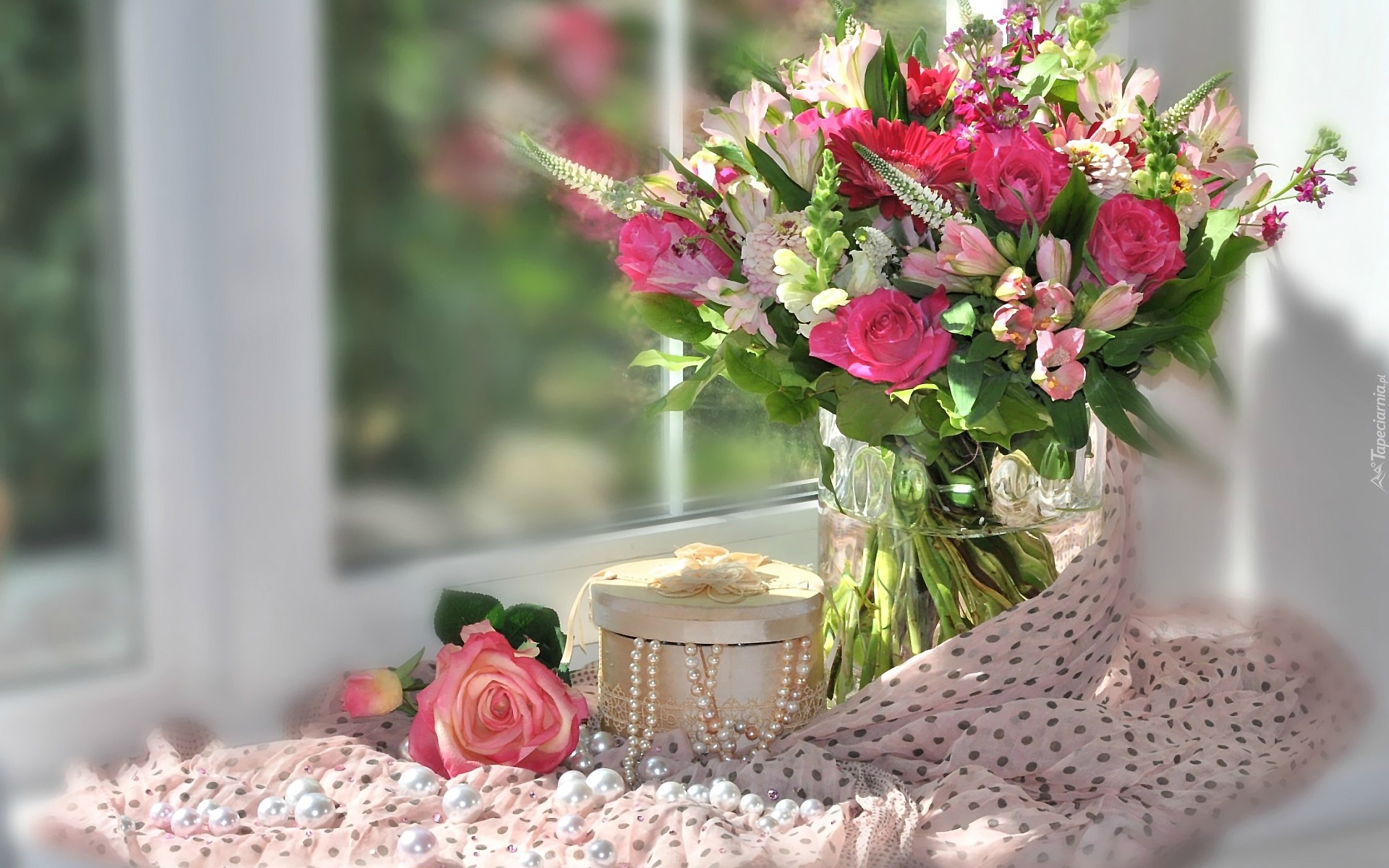 Edytor tapety: Bukiet, Róże, Gerbera, Budleja, Pudełko, Perły