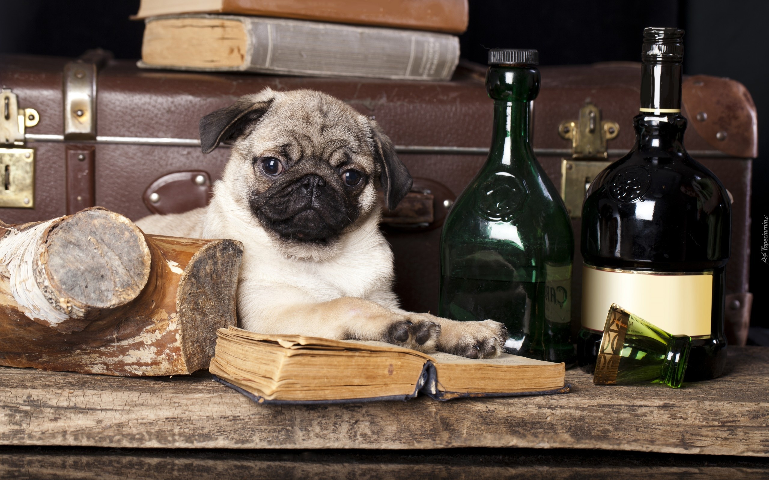 Edytor tapety: Pies, Szczeniak, Mops, Butelki