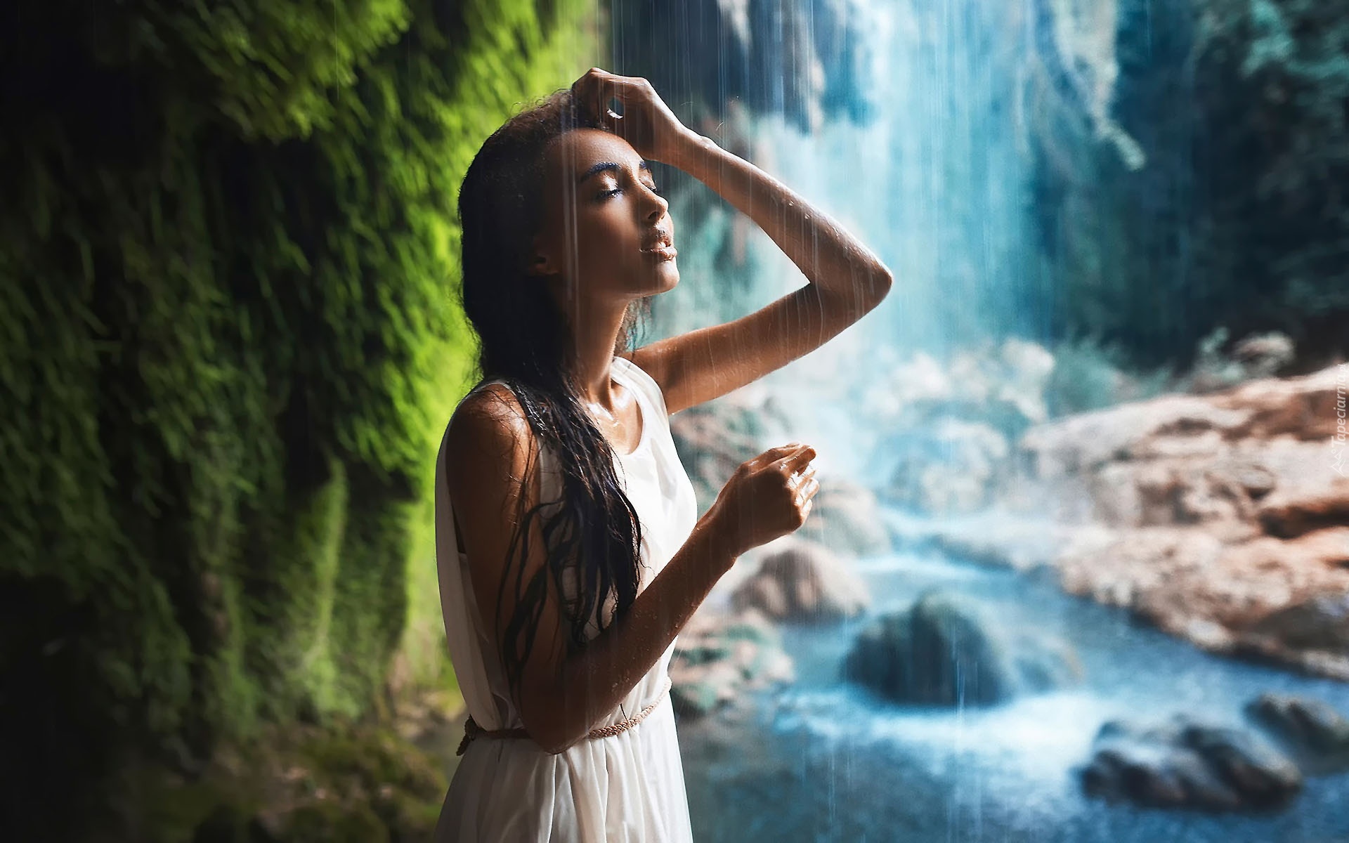 Edytor tapety: Brunetka, Wodospad, Krople, Wody