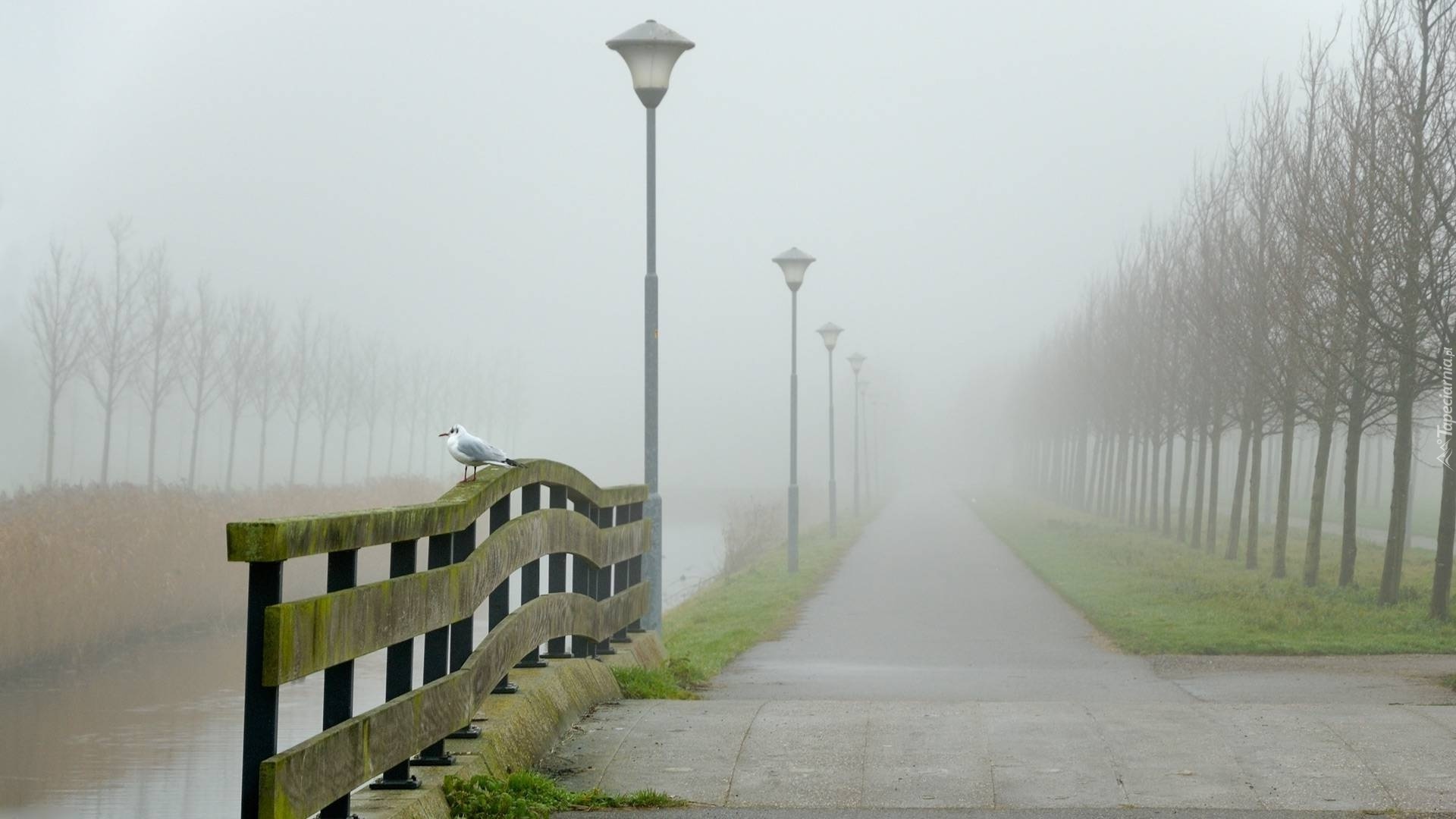 Edytor tapety: Park, Drzewa, Rzeka, Mgła, Mewa