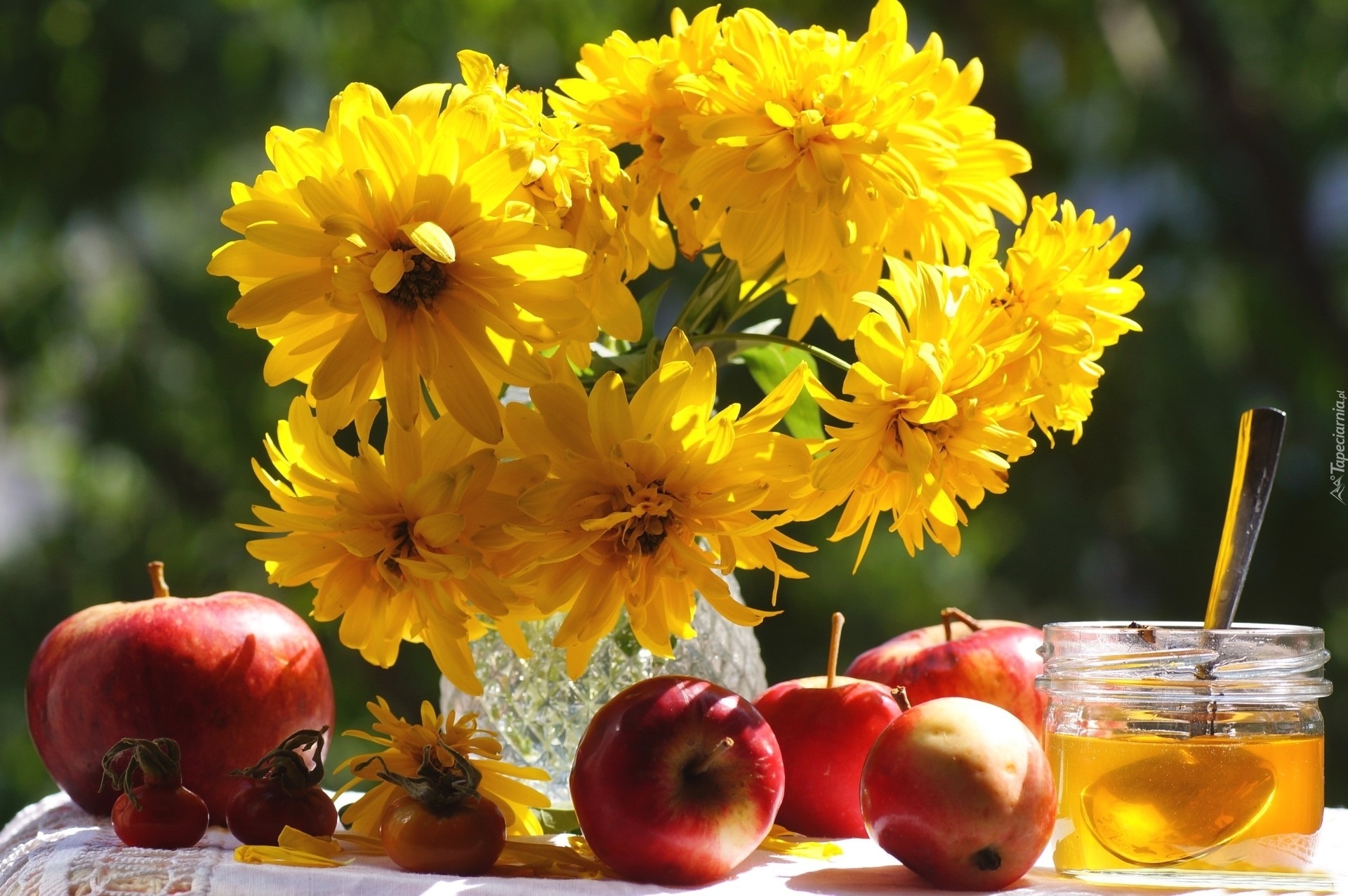Edytor tapety: Zolte, Kwiaty, Bukiet, Jablka, Miod