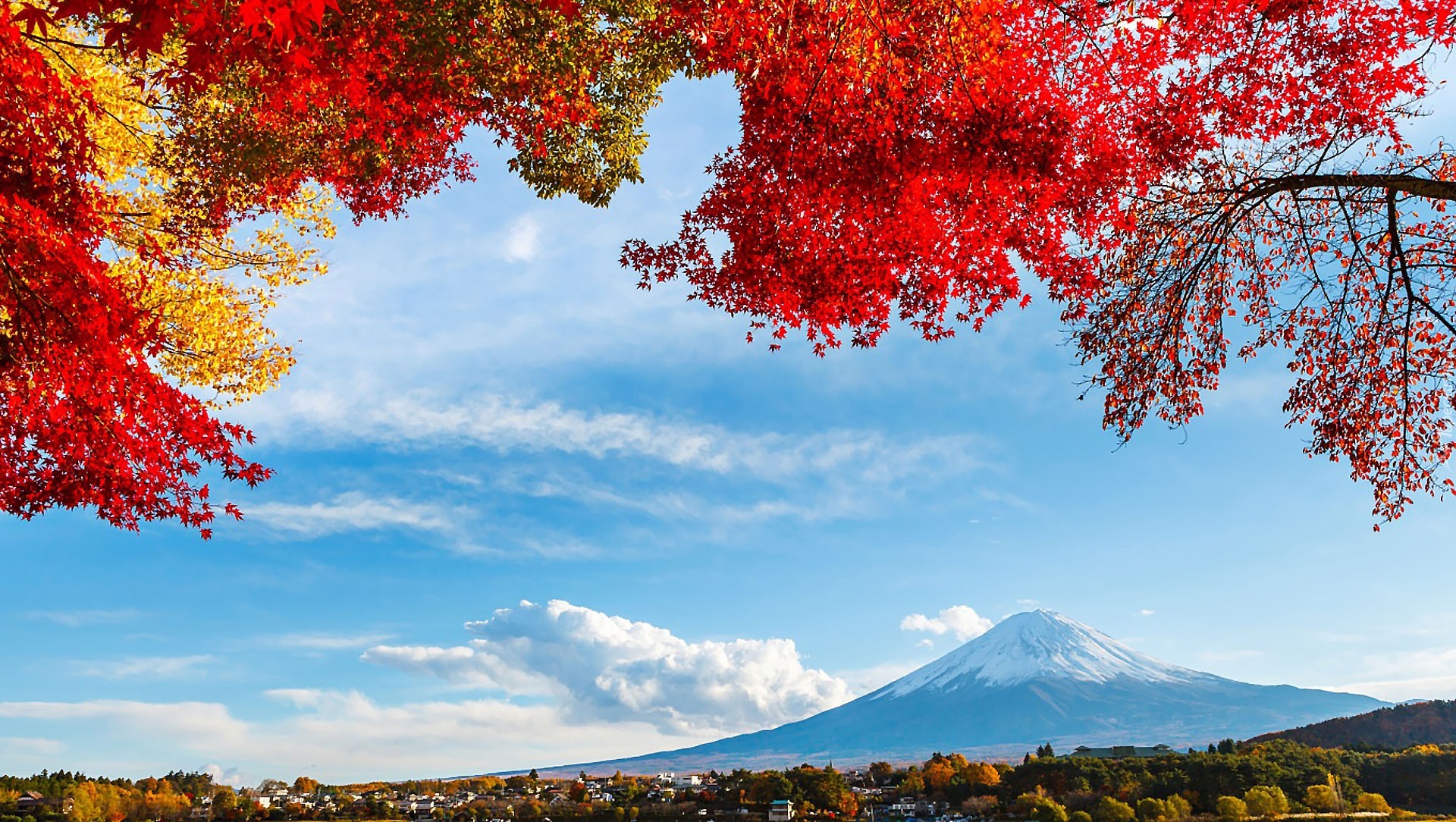 Edytor tapety: Kolorowe, Liście, Gałęzie, Drzewa, Góra, Chmury