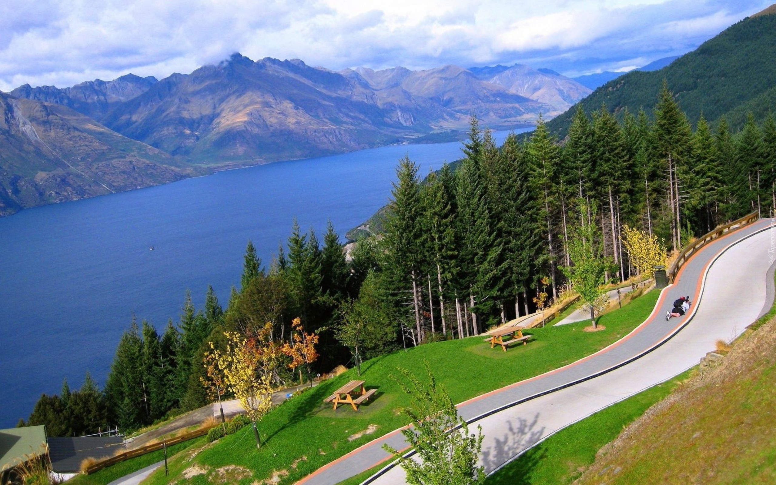 Edytor tapety: Góry, Jezioro, Las, Droga