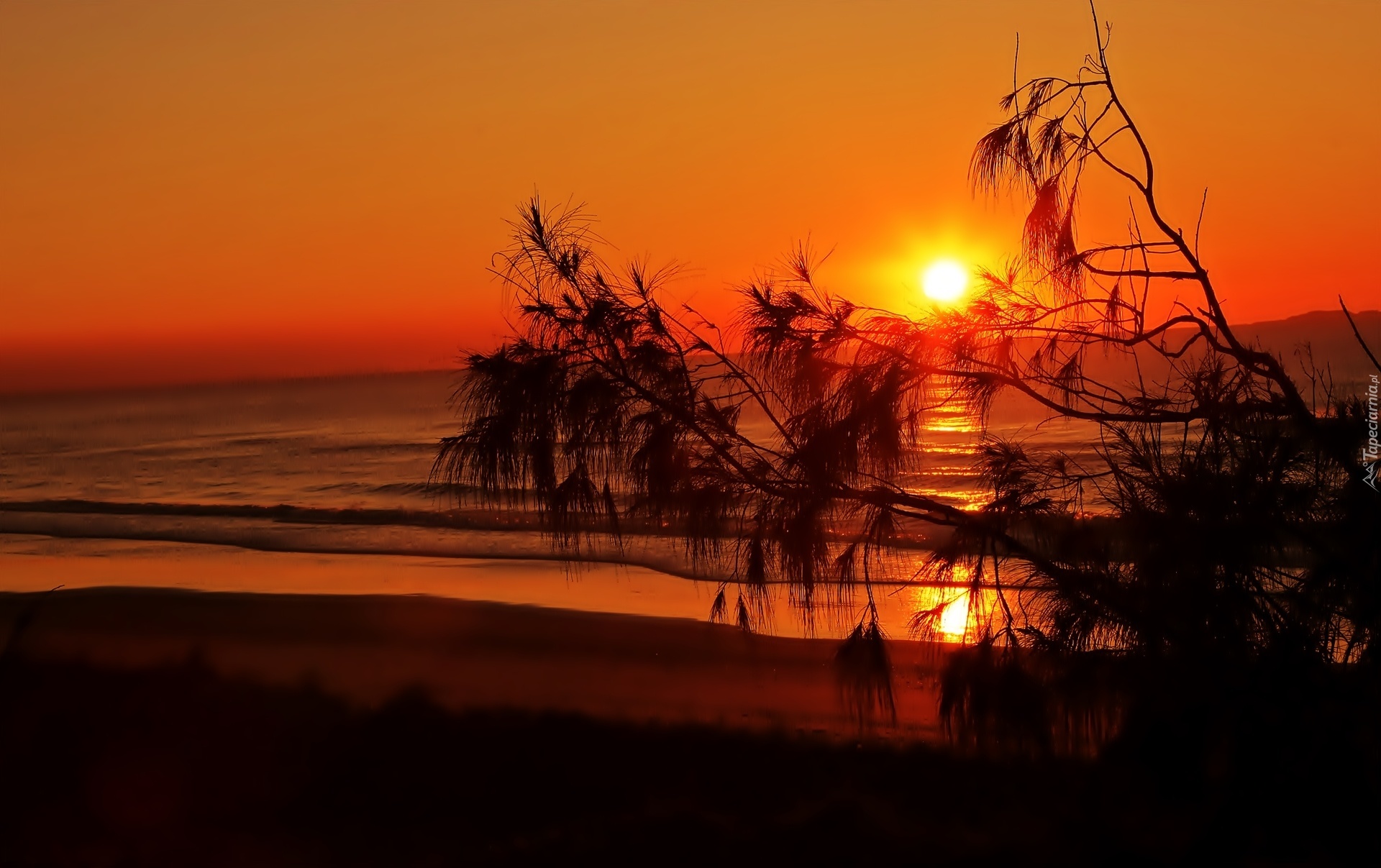Edytor tapety: Zachód, Słońca, Morze, Gałęzie, Drzew