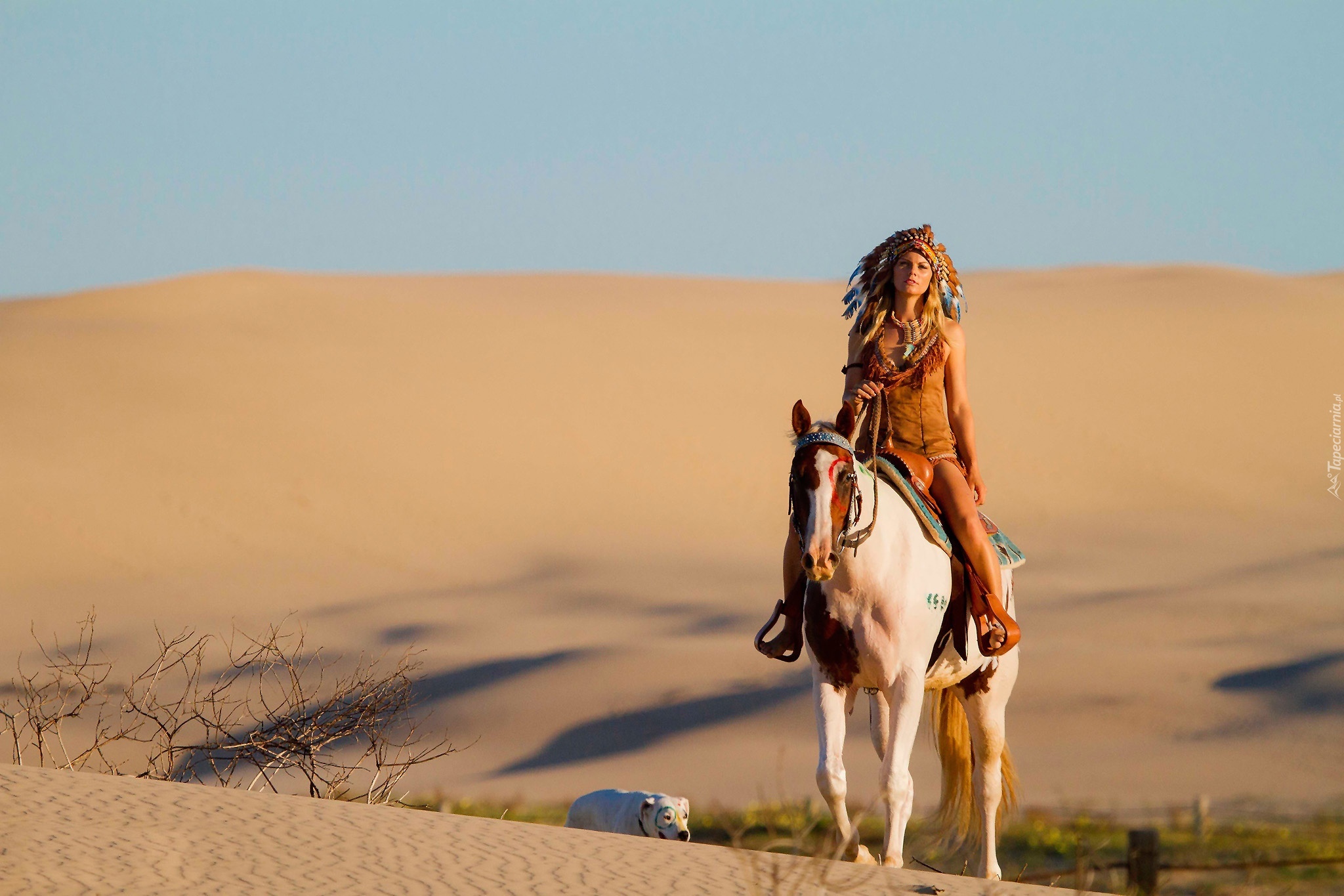 Edytor tapety: Pustynia, Dziewczyna, Pióropusz, Koń, Pies