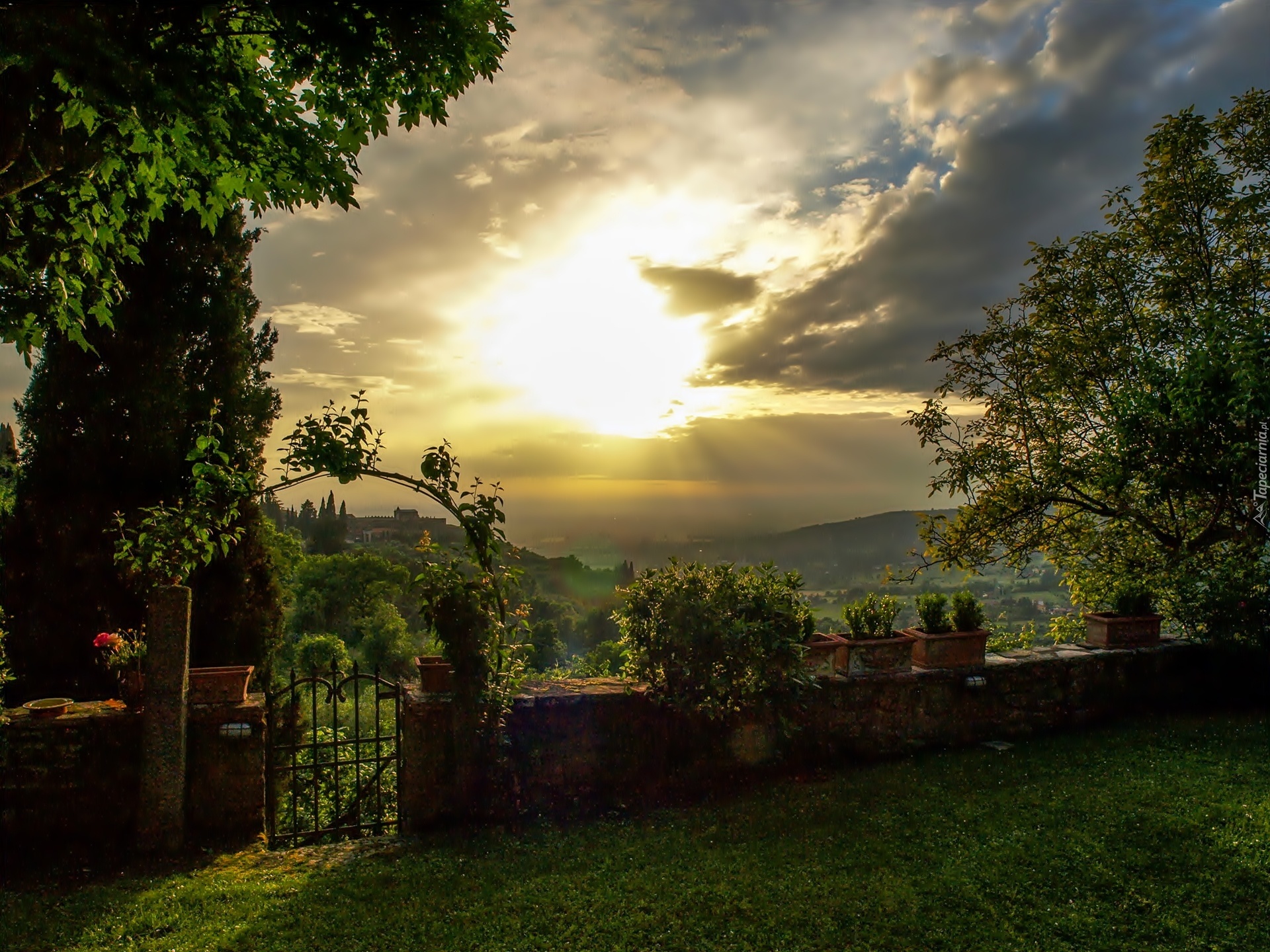 Edytor tapety: Przebijające, Światło, Ogród, Ogrodzenie, Drzewa