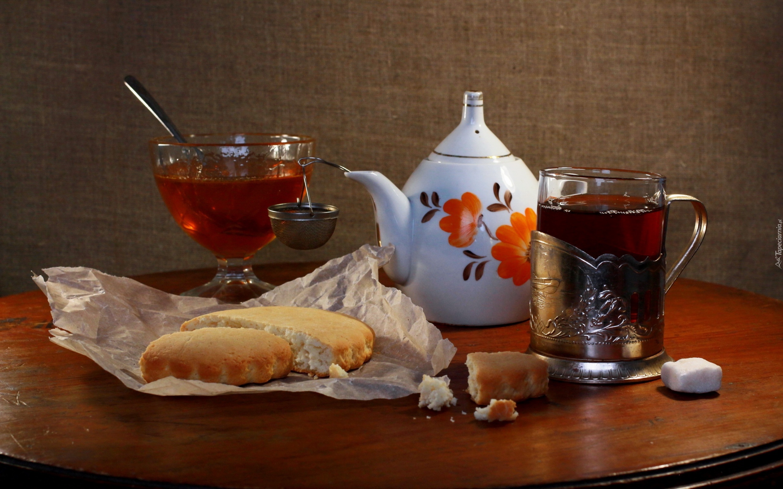 Edytor tapety: Dzbanek, Szklanka, Herbata, Bułki, Kompozycja