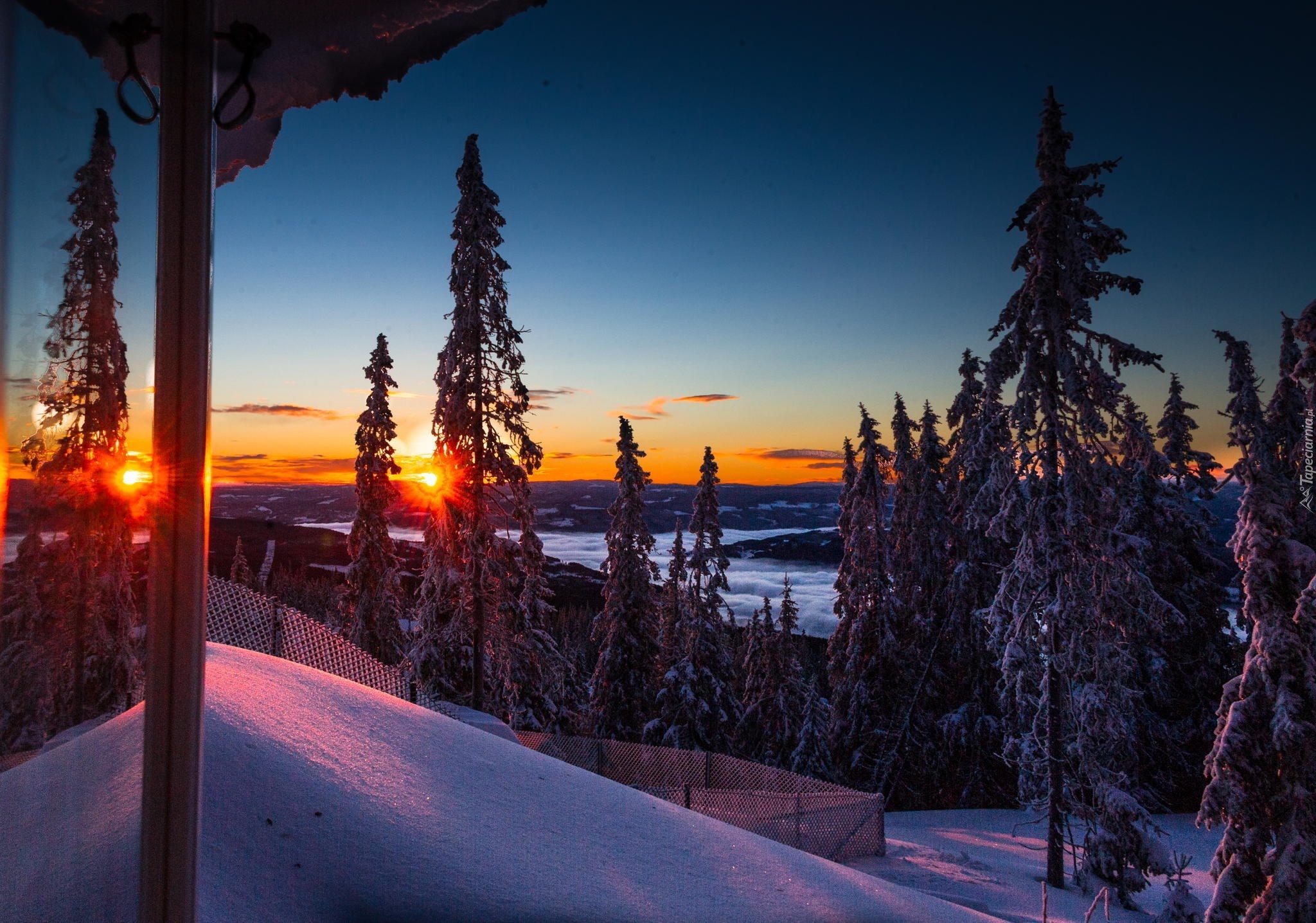 Edytor tapety: Zima, Las, Zachód Słońca