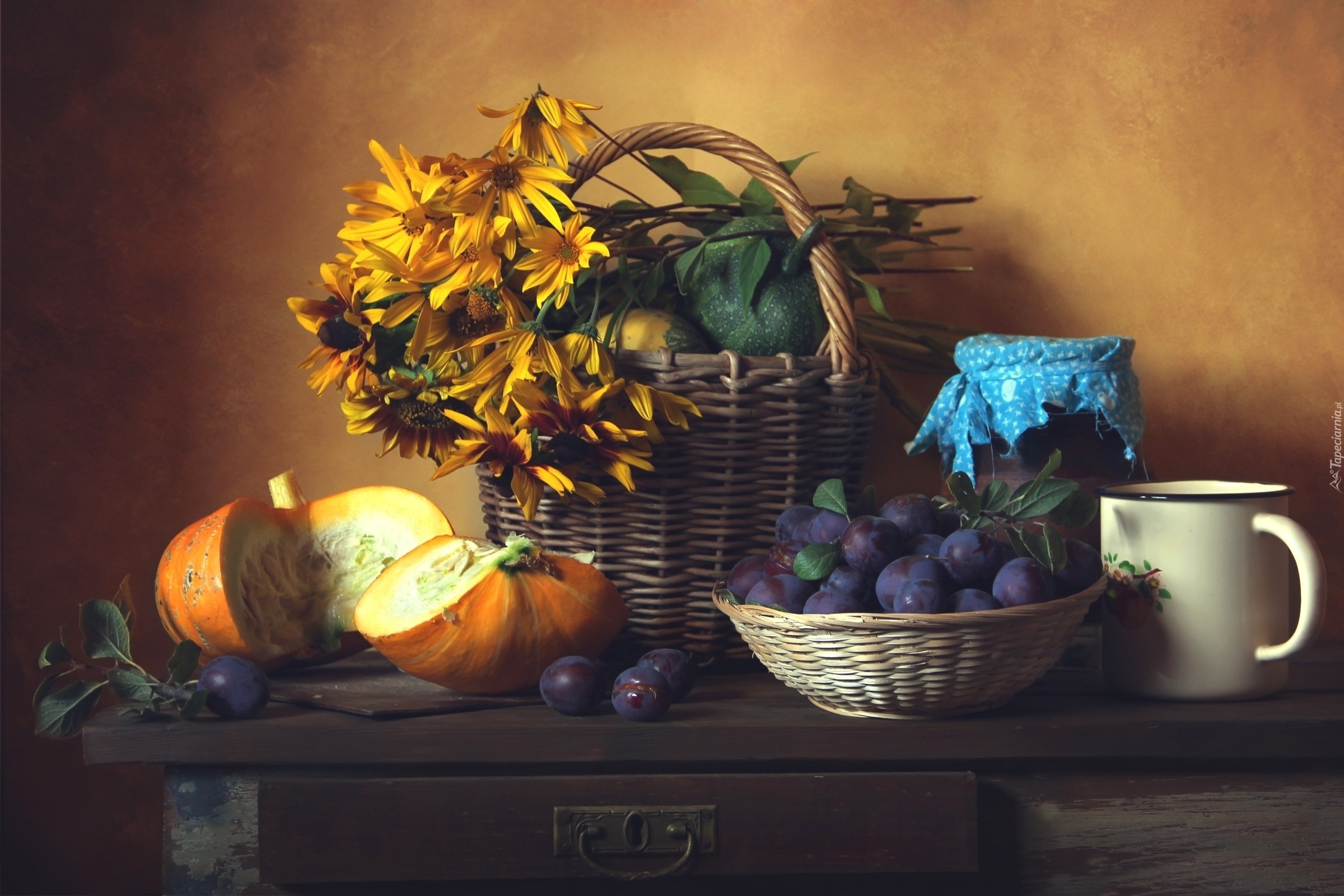 Edytor tapety: Kwiaty, Bukiet, Sloneczniki, Sliwki, Dynia