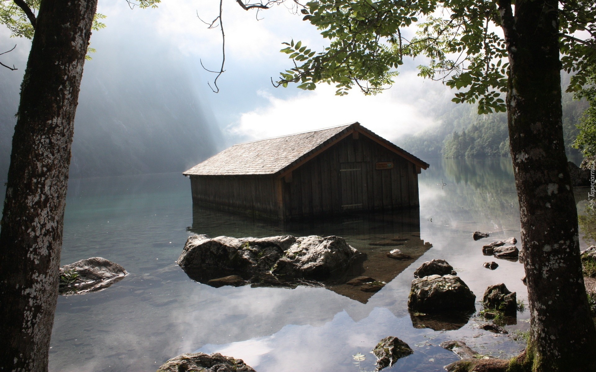 Edytor tapety: Jezioro, Domek, Las, Kamienie