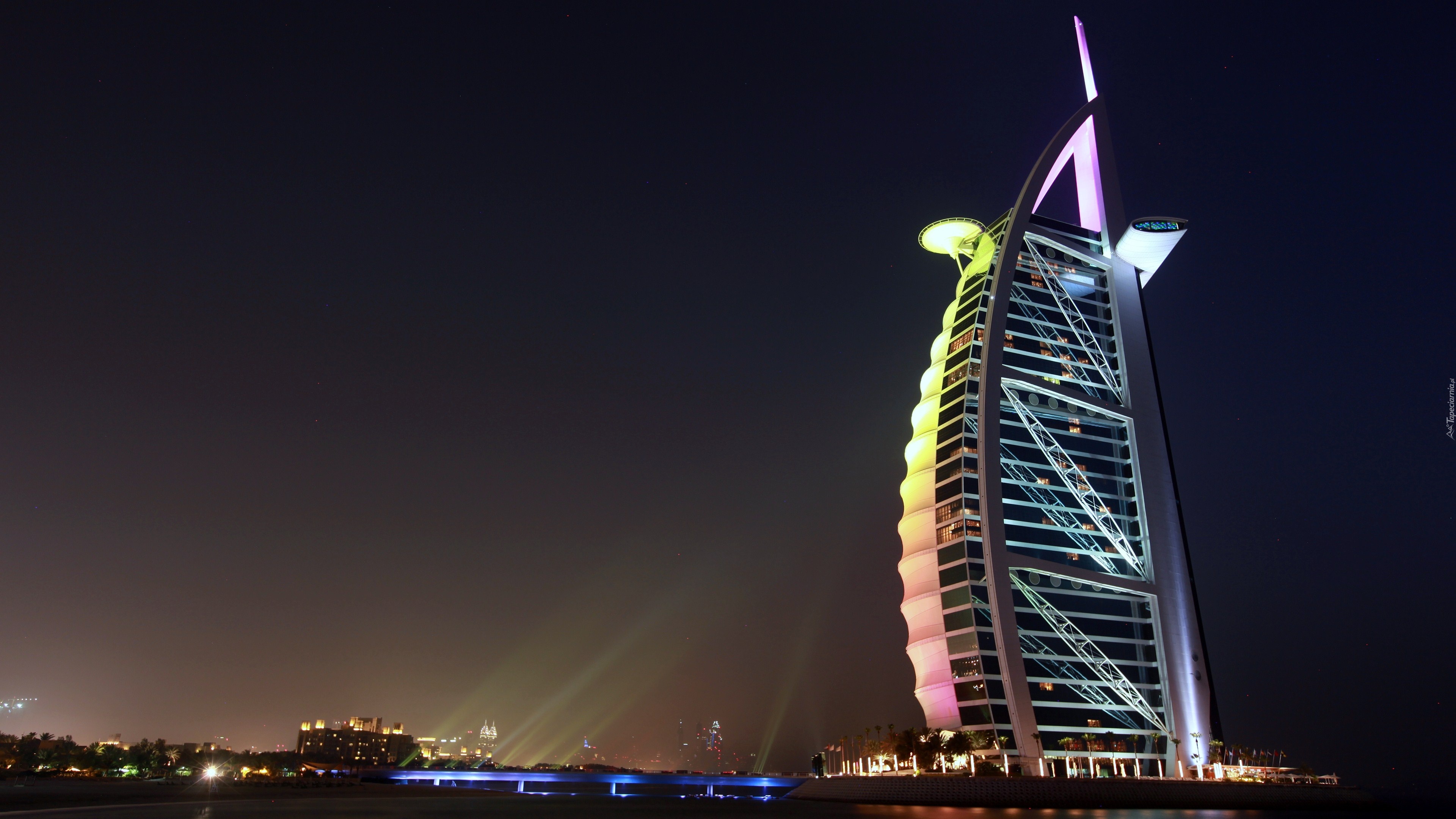 Edytor tapety: Zjednoczone Emiraty Arabskie, Dubaj, Hotel, Burdż al-Arab, Budynki, Palmy, Miasto Nocą