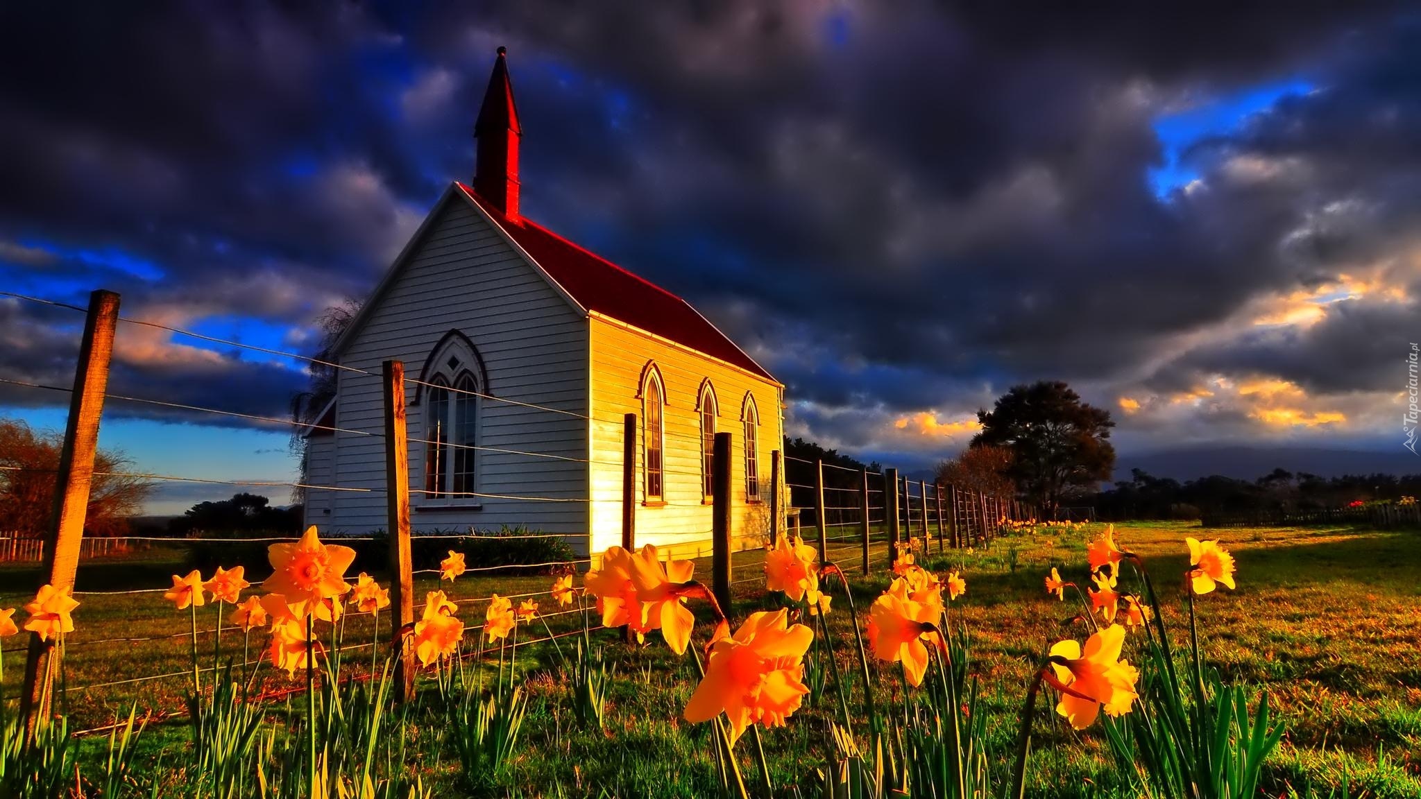 Edytor tapety: Kościółek, Kwiaty, Chmury