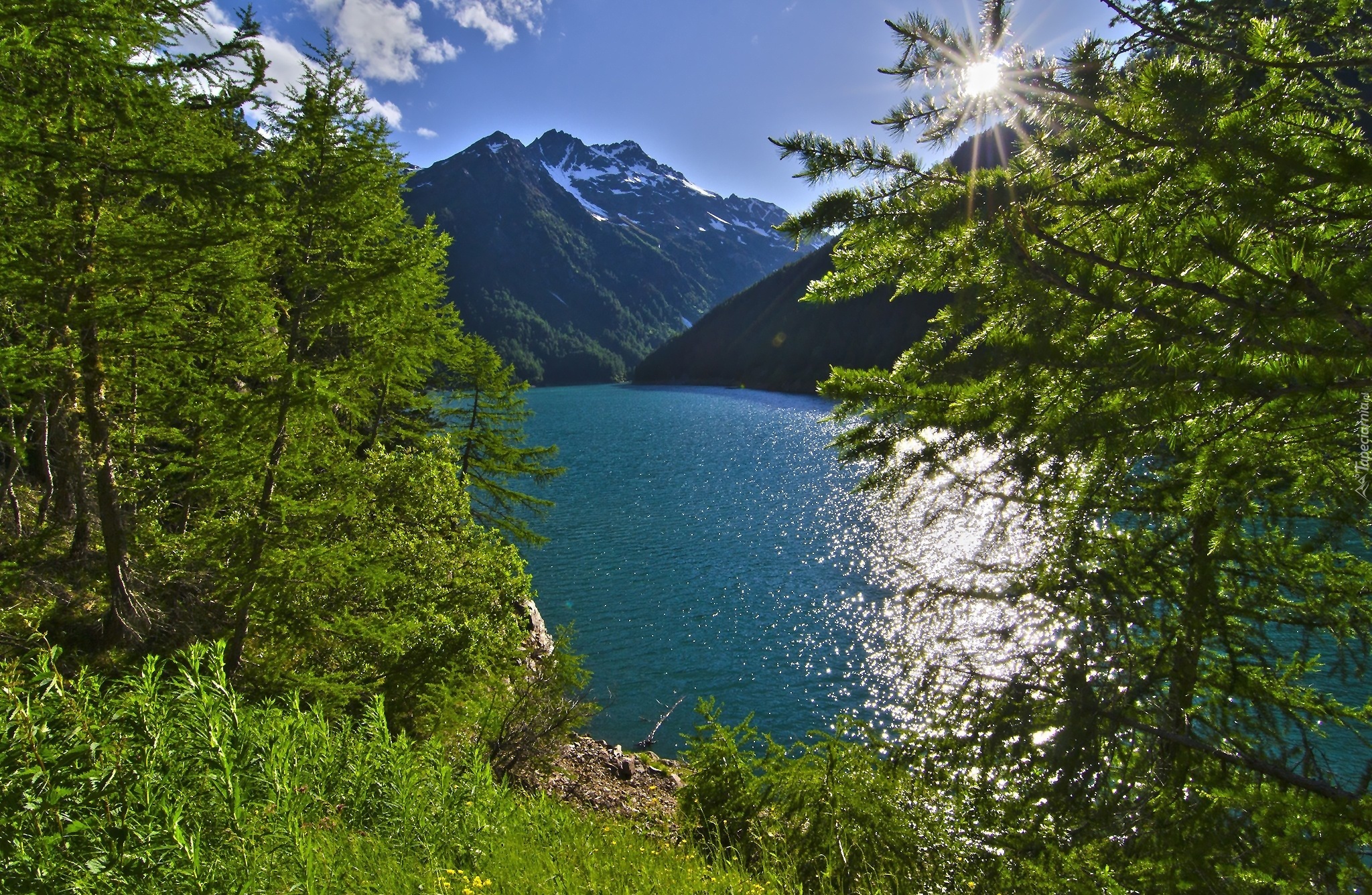 Edytor tapety: Jezioro, Góry, Promienie, Słońca, Drzewa