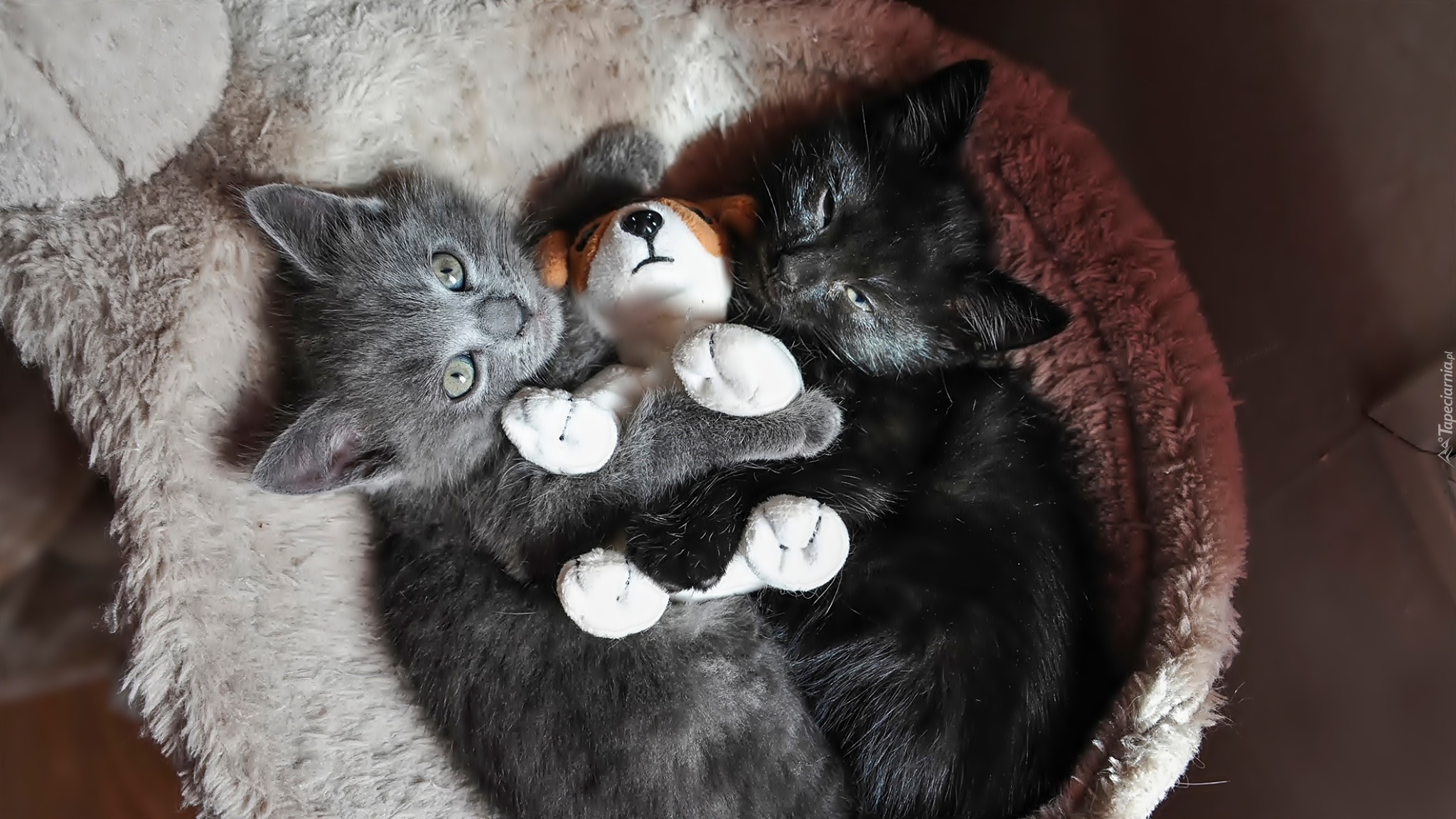 Edytor tapety: Dwa, Małe, Kotki, Koszyk, Zabawka, Pluszowy, Piesek