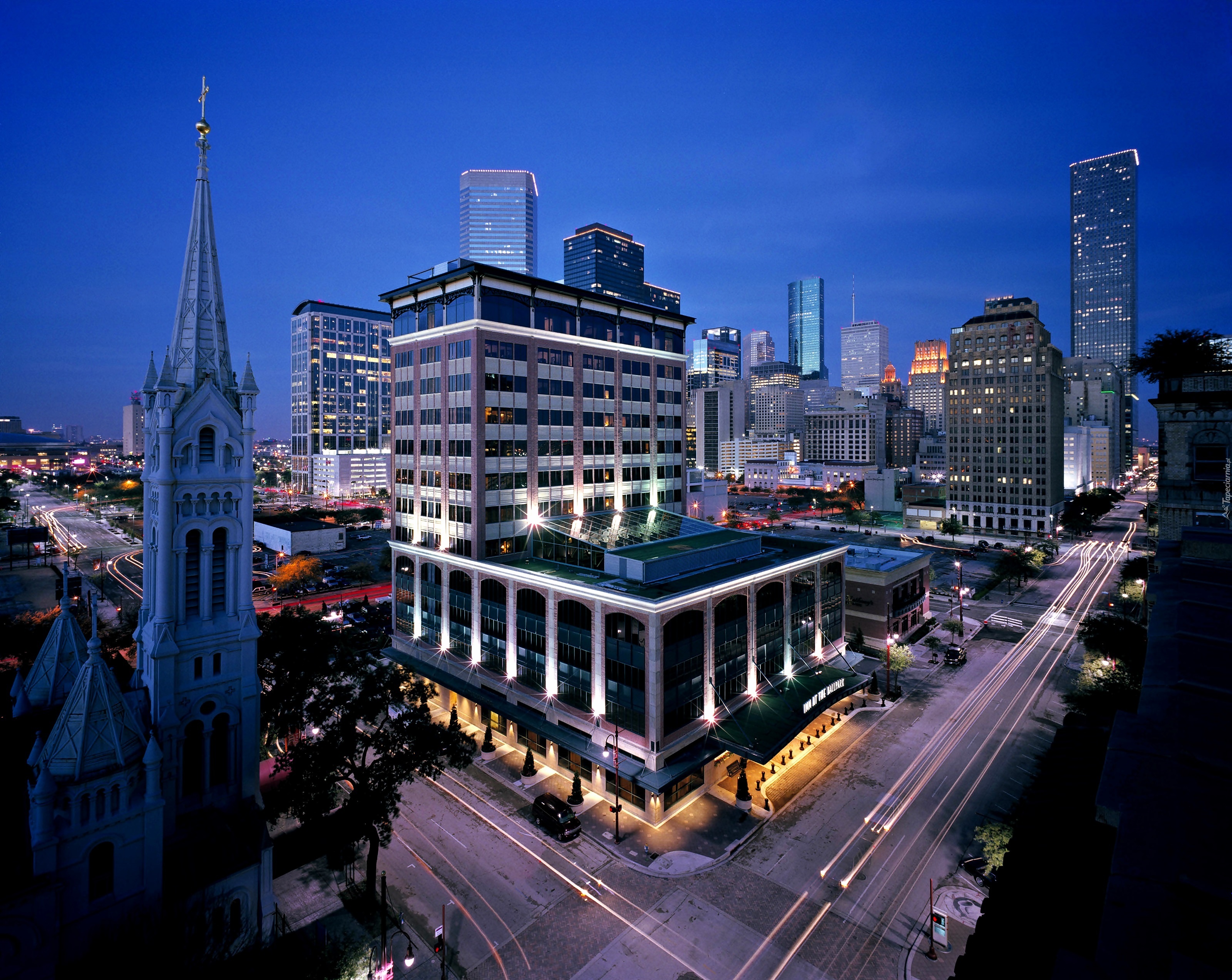 Edytor tapety: Drapacze, Chmur, Kościół, Houston, Fragment, Miasta, Nocą