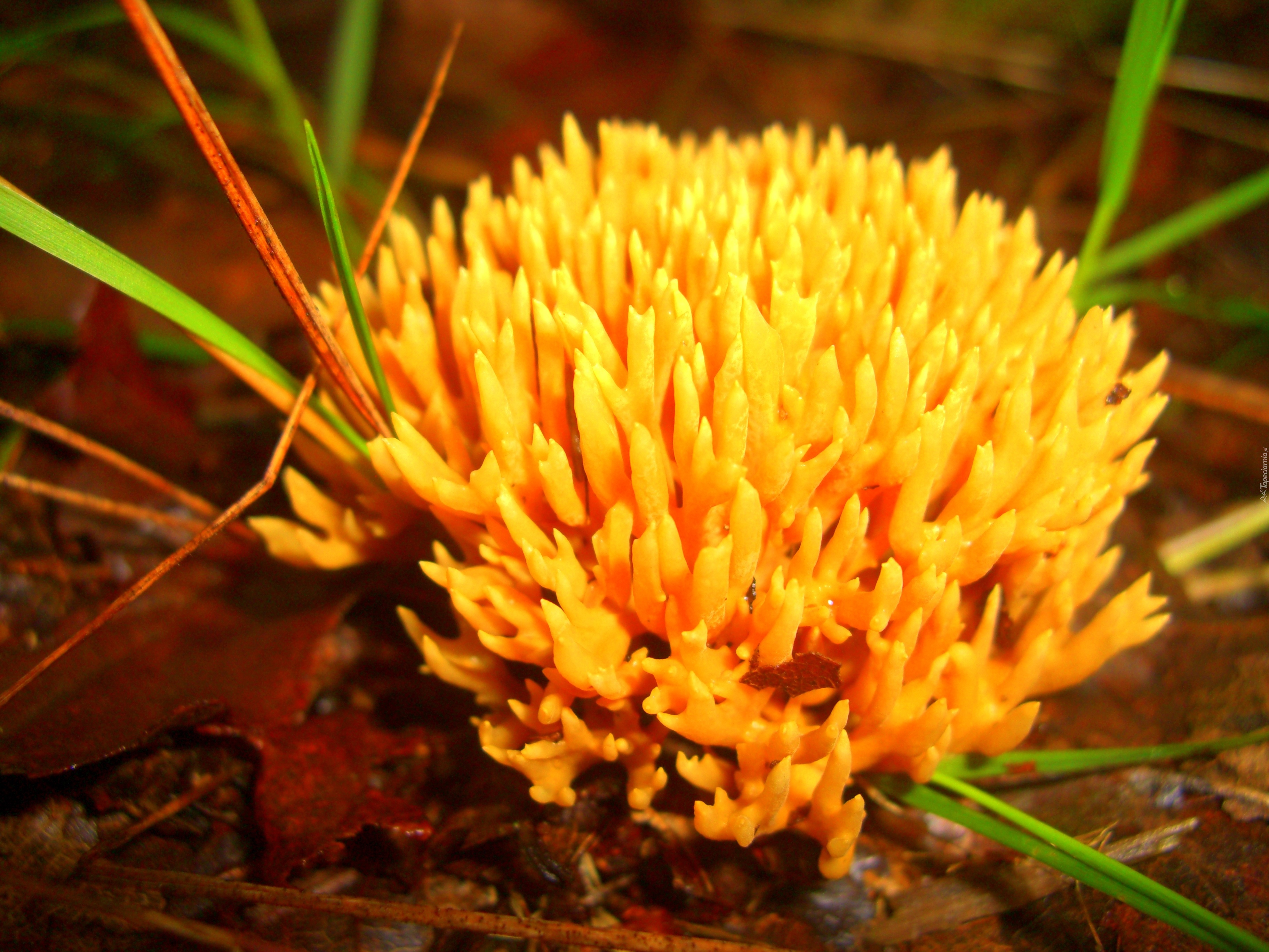Edytor tapety: Grzyb, Gałęziak, Koralówka, Żółta, Źdźbła, Trawy, Liście, Makro