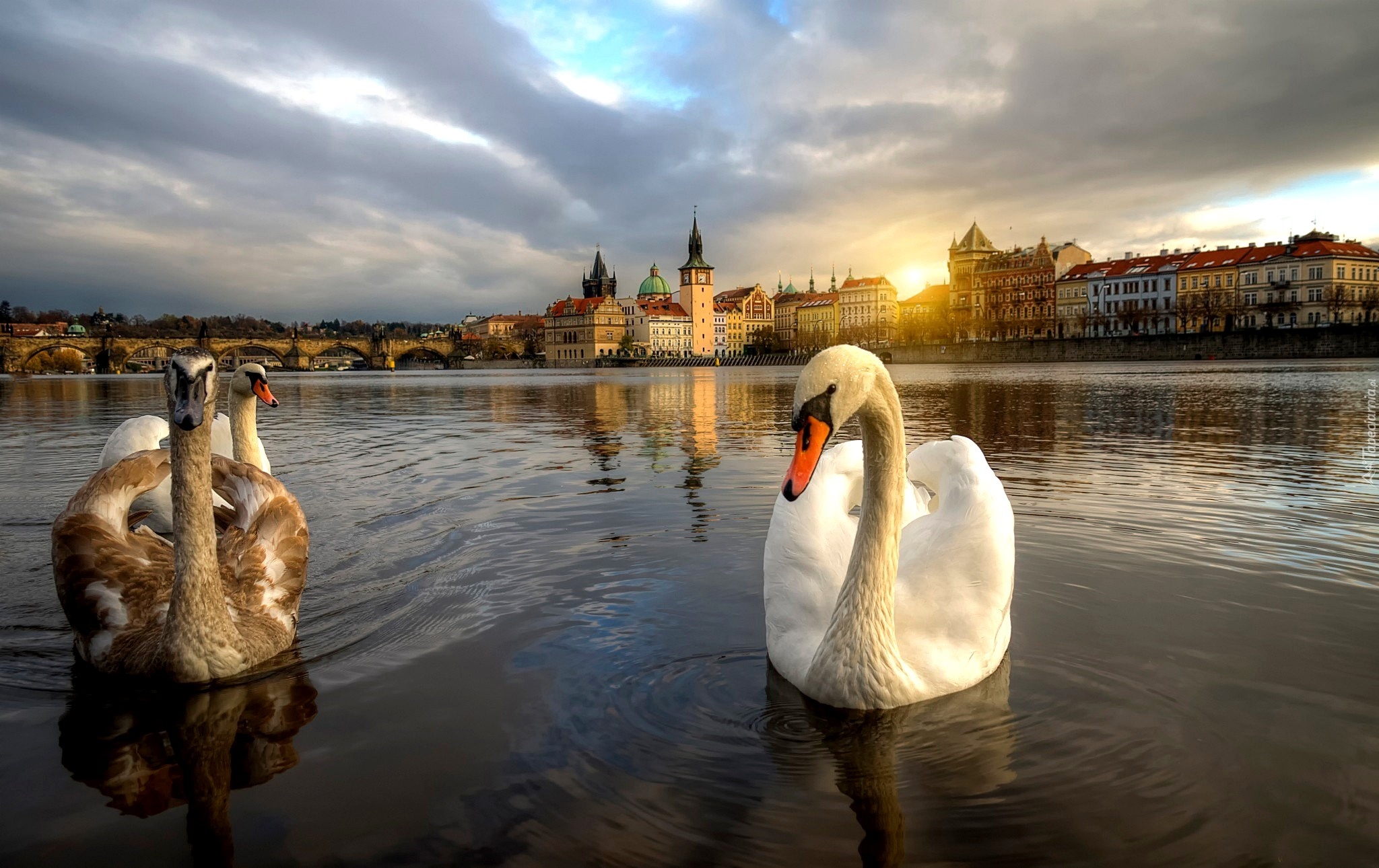 Edytor tapety: Łabędzie, Miasto, Rzeka