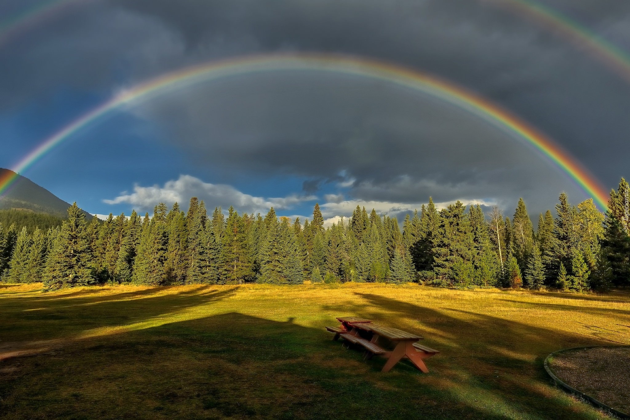 Edytor tapety: Niebo, Tęcza, Las, Ławka