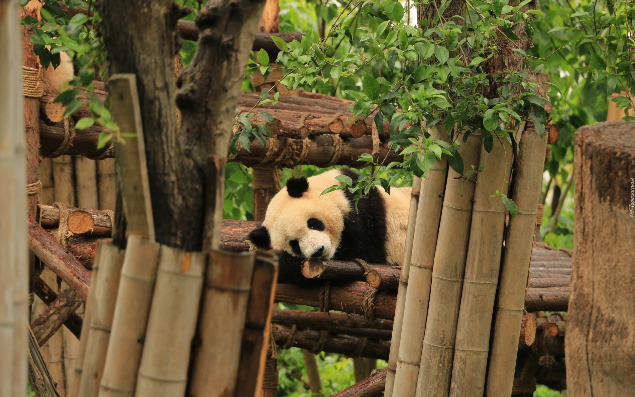 Edytor tapety: Panda, Ogrodzenie, Drzewa