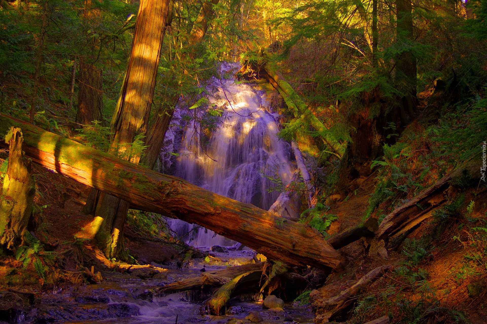 Edytor tapety: Las, Powalone drzewa, Przebijające światło, Wodospad