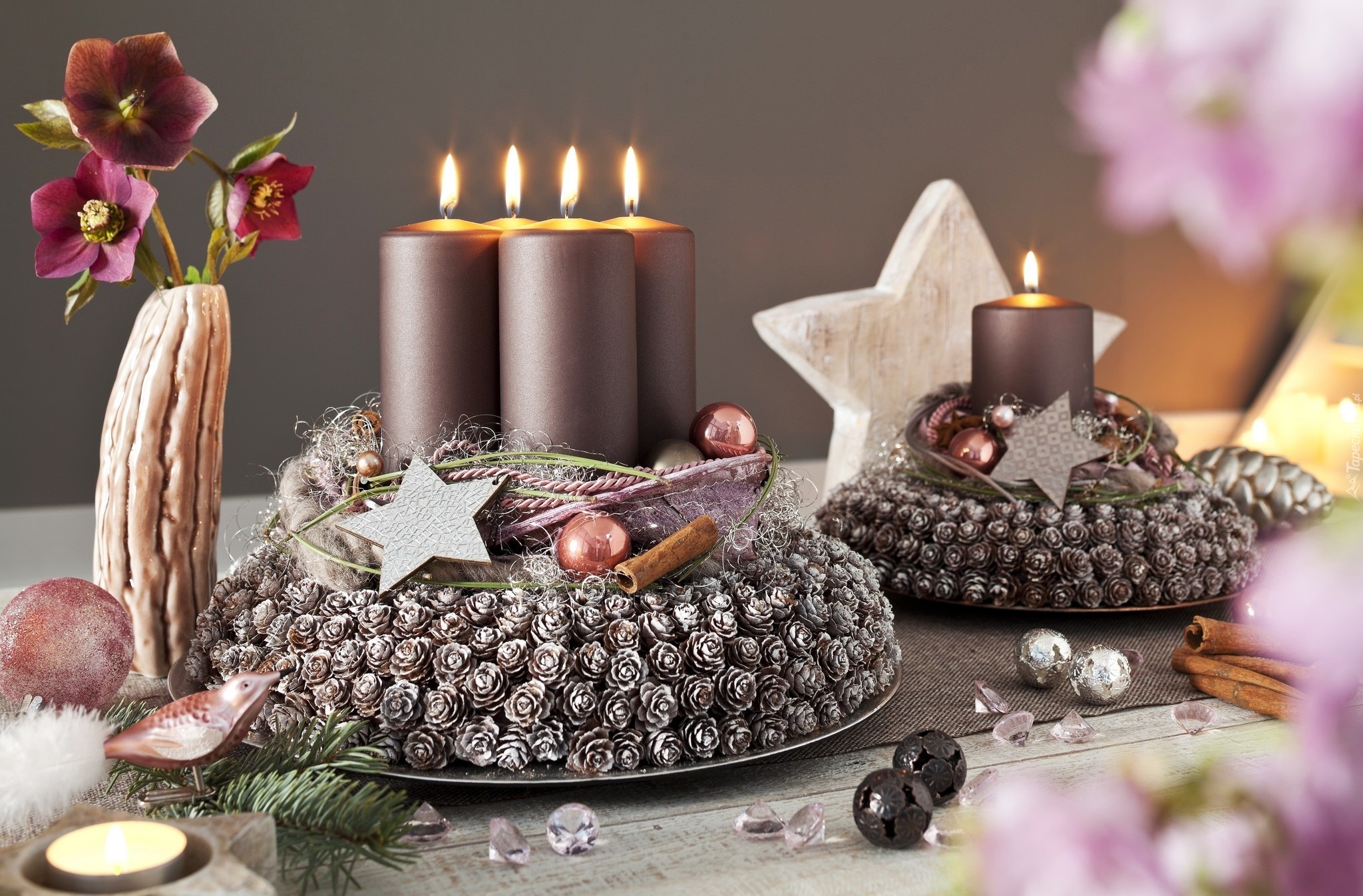 Edytor tapety: Świąteczna, Kompozycja, Świeca, Wianki, Kwiaty