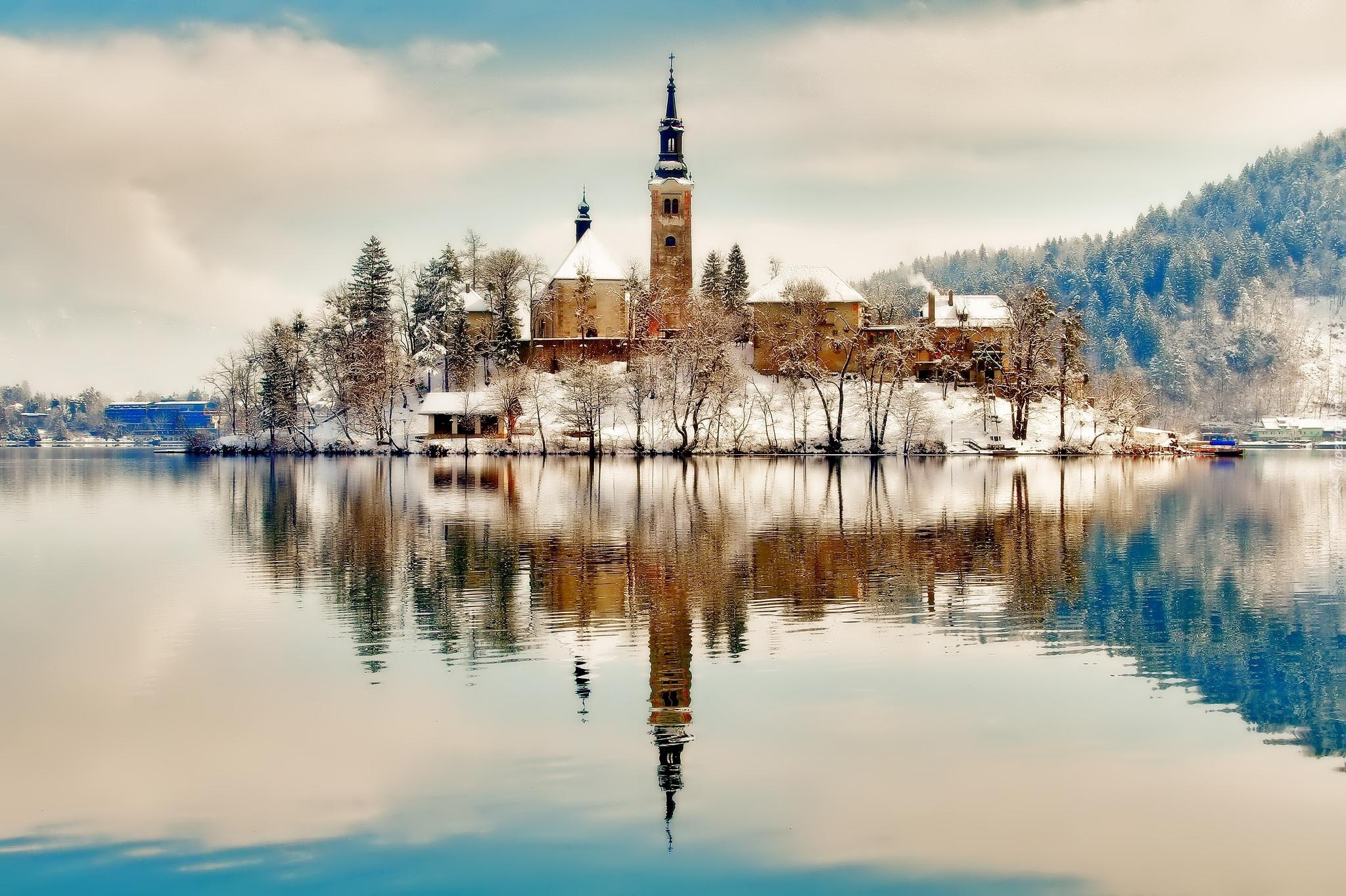 Edytor tapety: Kościół, Jezioro, Zima