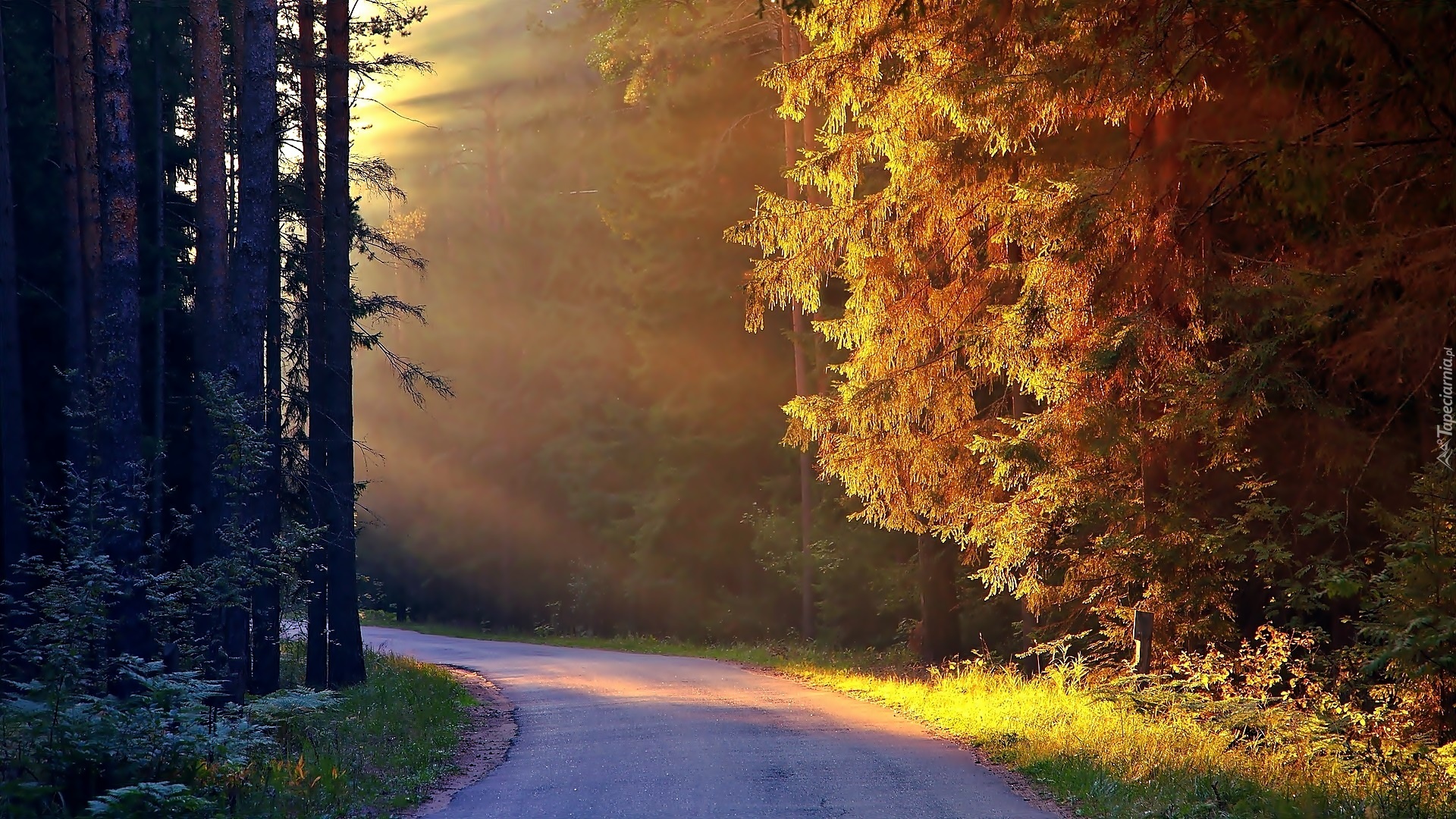 Edytor tapety: Droga, Las, Promienie, Słońca
