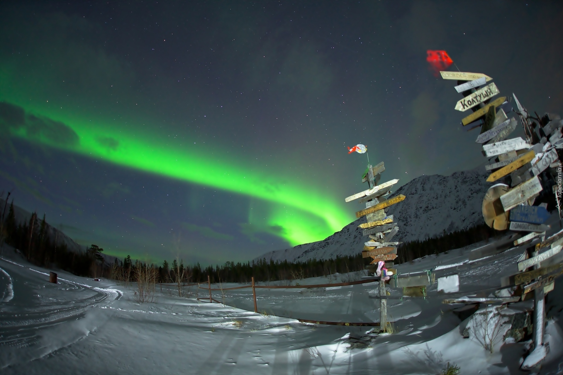 Edytor tapety: Zorza, Polarna, Śnieg, Góry, Noc, Drogowskazy