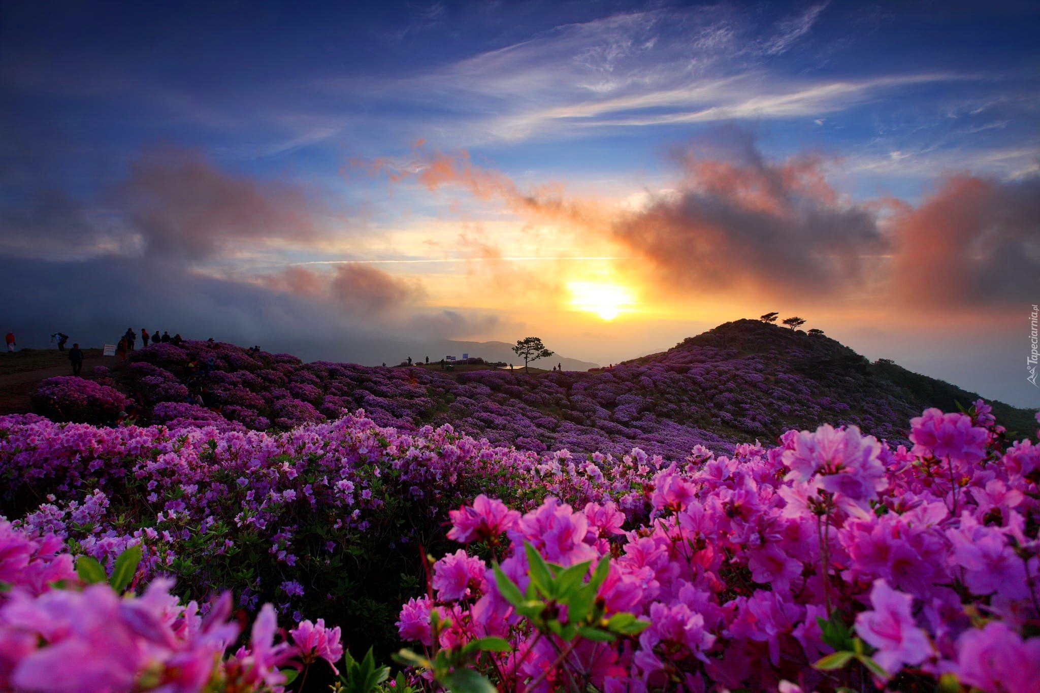 Edytor tapety: Zachód słońca, Kwiaty, Wzgórze