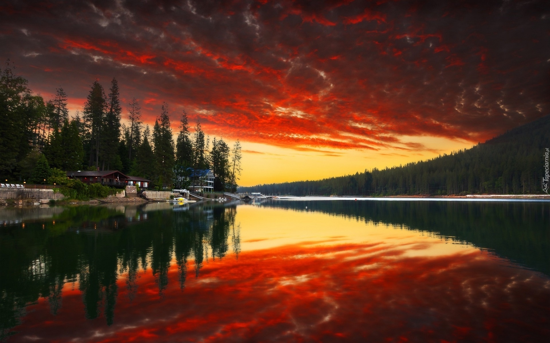 Edytor tapety: Jezioro, Lasy, Zachód słońca, Czerwone chmury, Odbicie