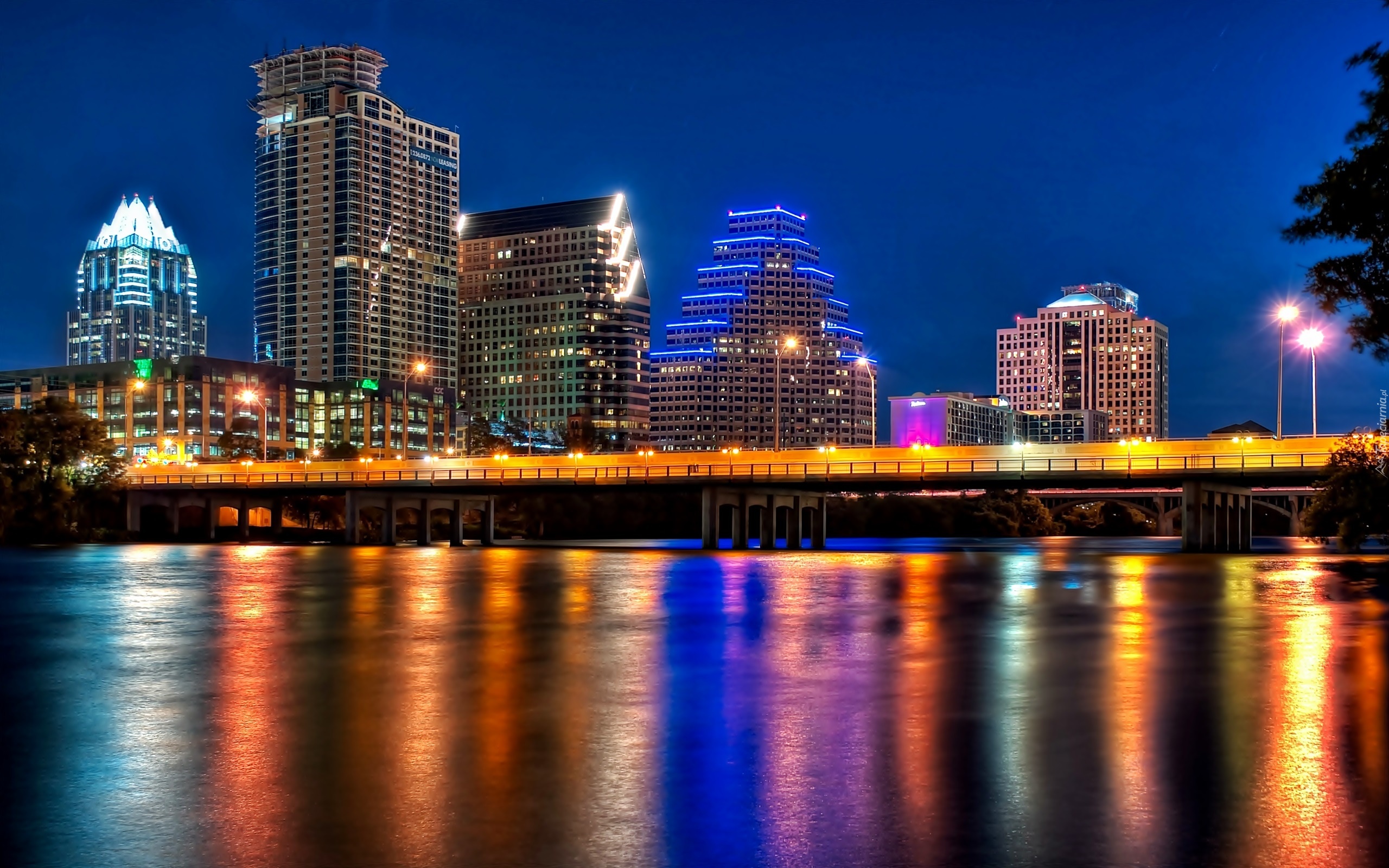 Edytor tapety: Drapacze, Chmur, Rzeka, Kolorado, Most, Austin, Miasto, Nocą