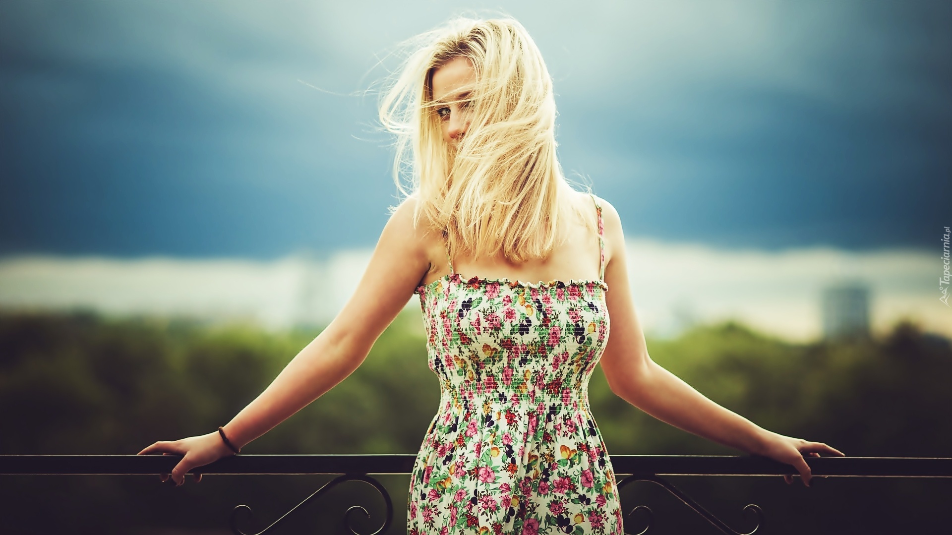 Edytor tapety: Kobieta, Blondynka, Kwiecista, Sukienka, Ogrodzenie