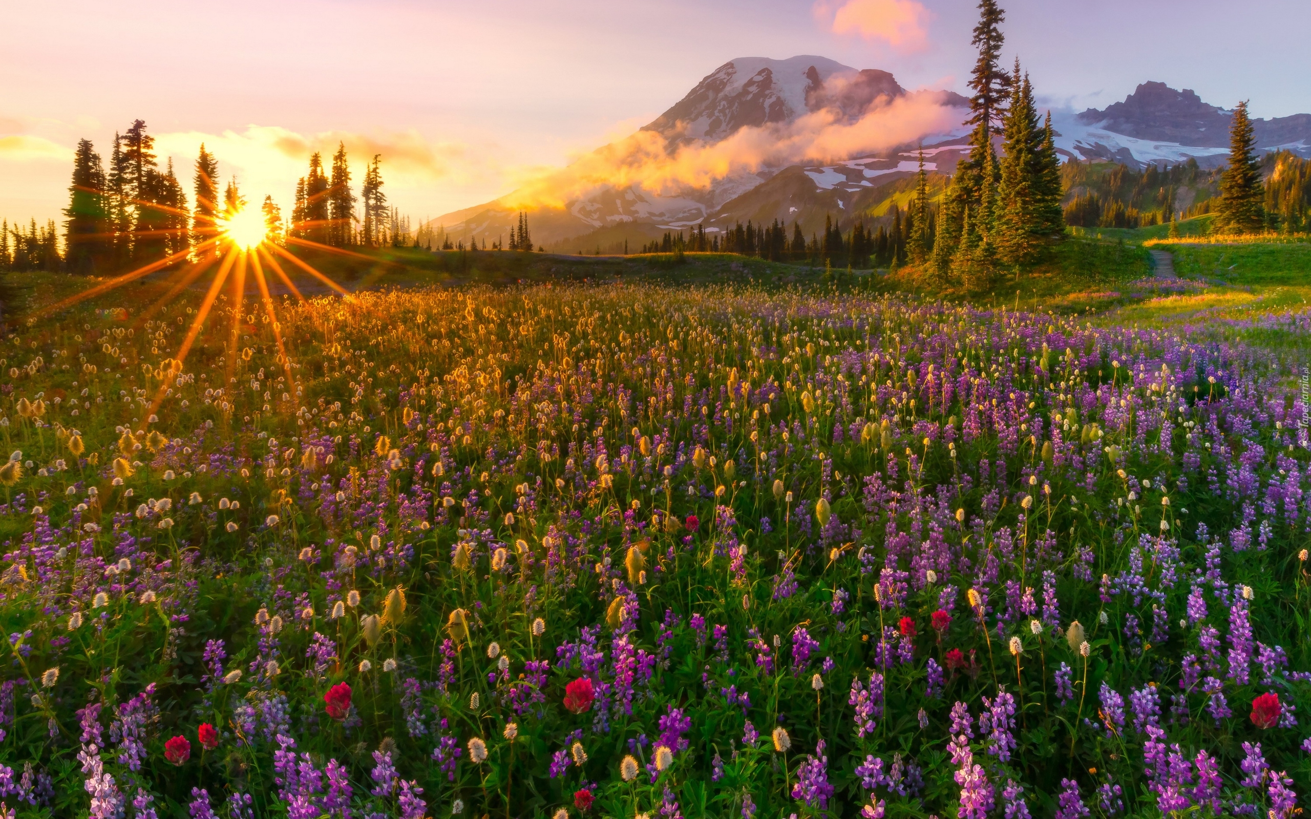 Edytor tapety: Góry, Las, Łąka, Kwiaty, Zachód Słońca