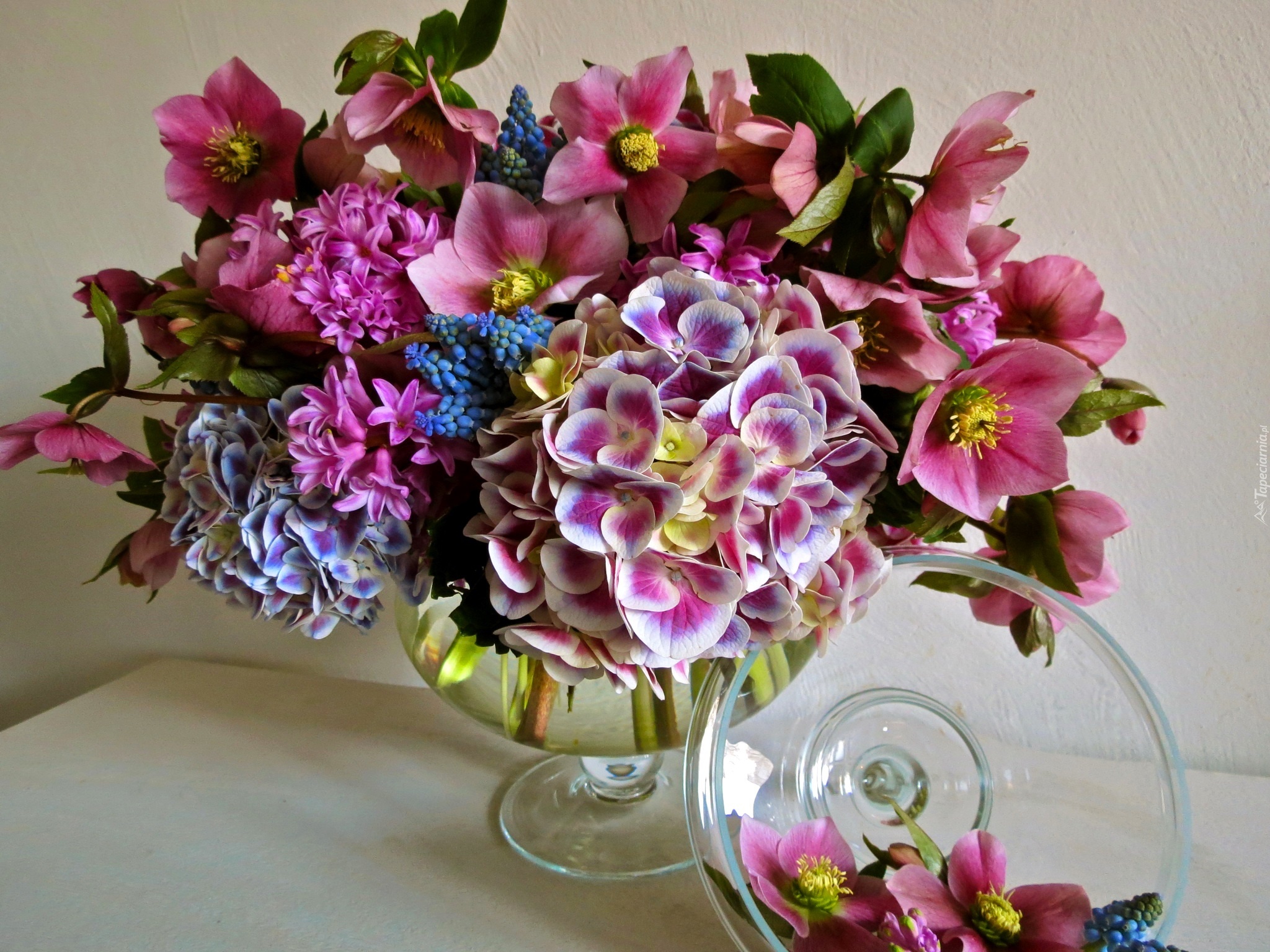 Edytor tapety: Ciemiernik, Hiacynty, Hortensja, Bukiet, Wazon