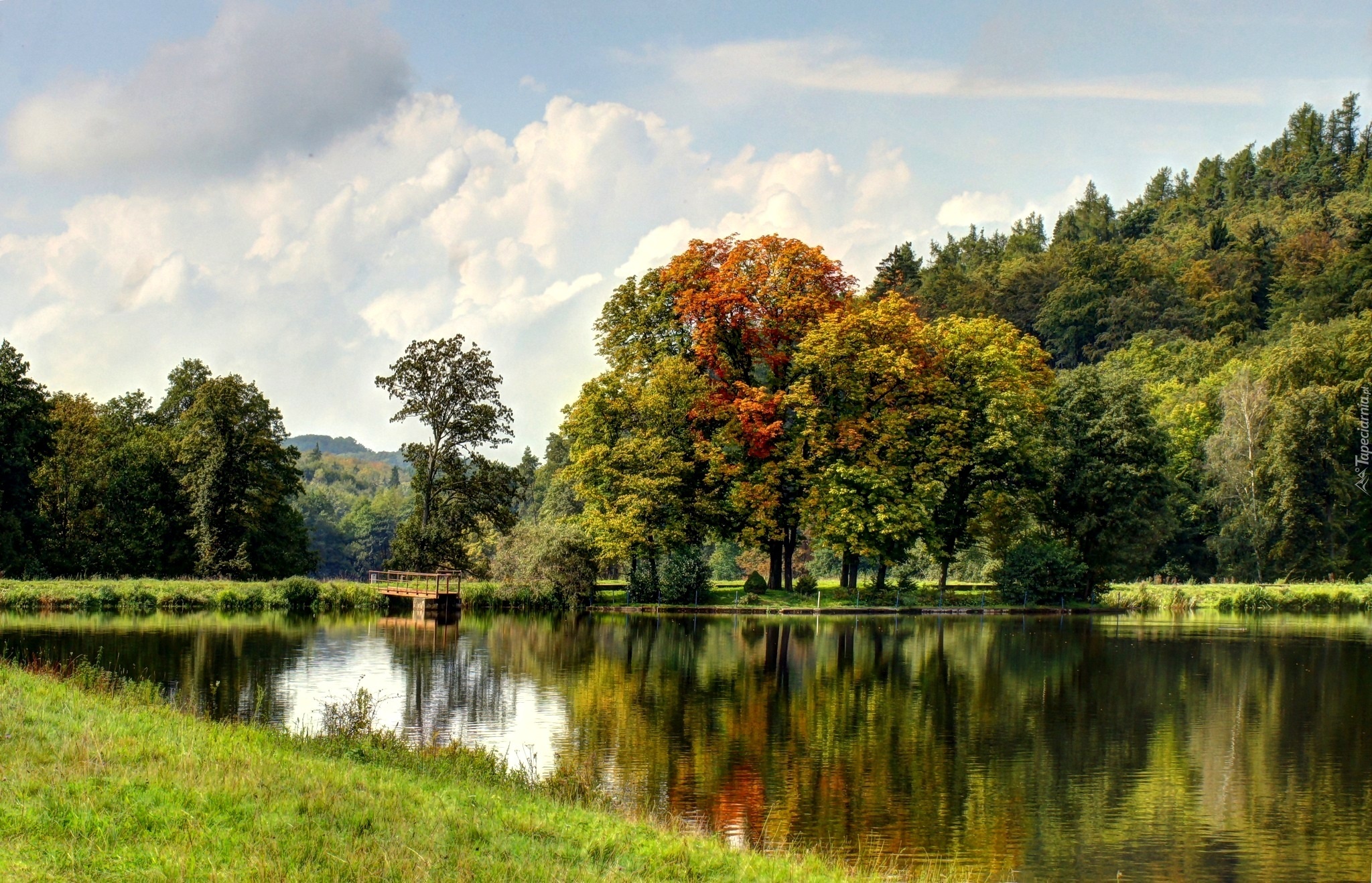 Edytor tapety: Jezioro, Pomost, Lasy, Jesień