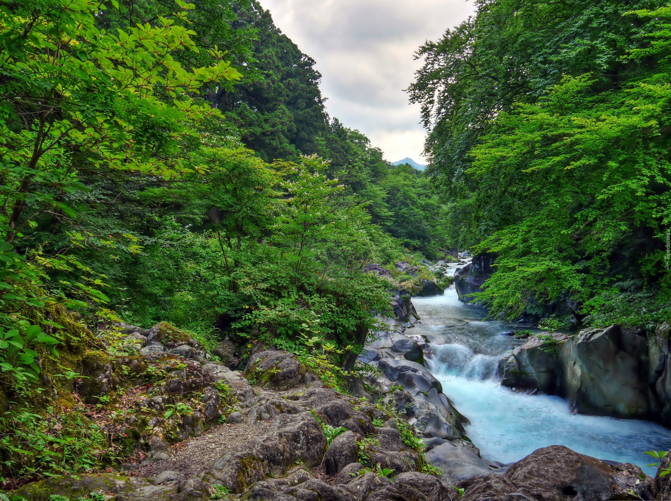 Edytor tapety: Las, Rzeka, Skały, Chmury