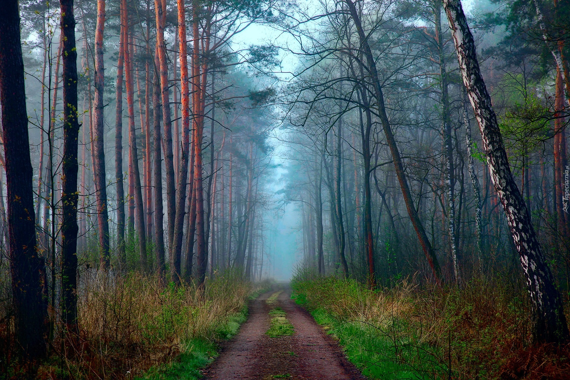 Edytor tapety: Las, Droga, Poranek, Mgła