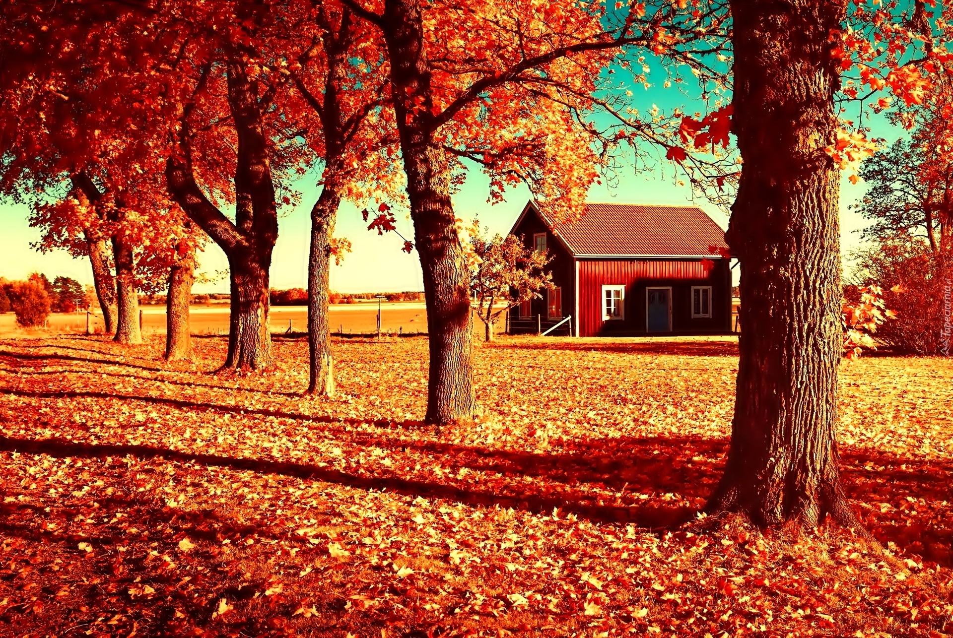 Edytor tapety: Jesień, Żółte, Liście, Drzewa, Domek