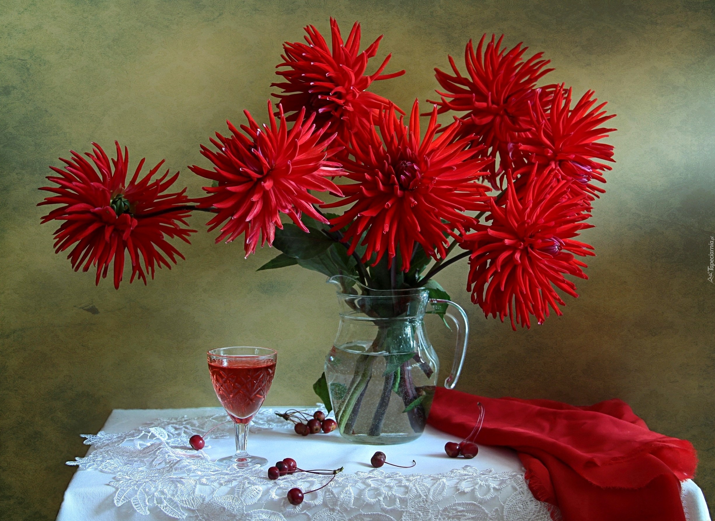 Edytor tapety: Czerwone, Dalie, Kieliszek, Bukiet Kwiatów