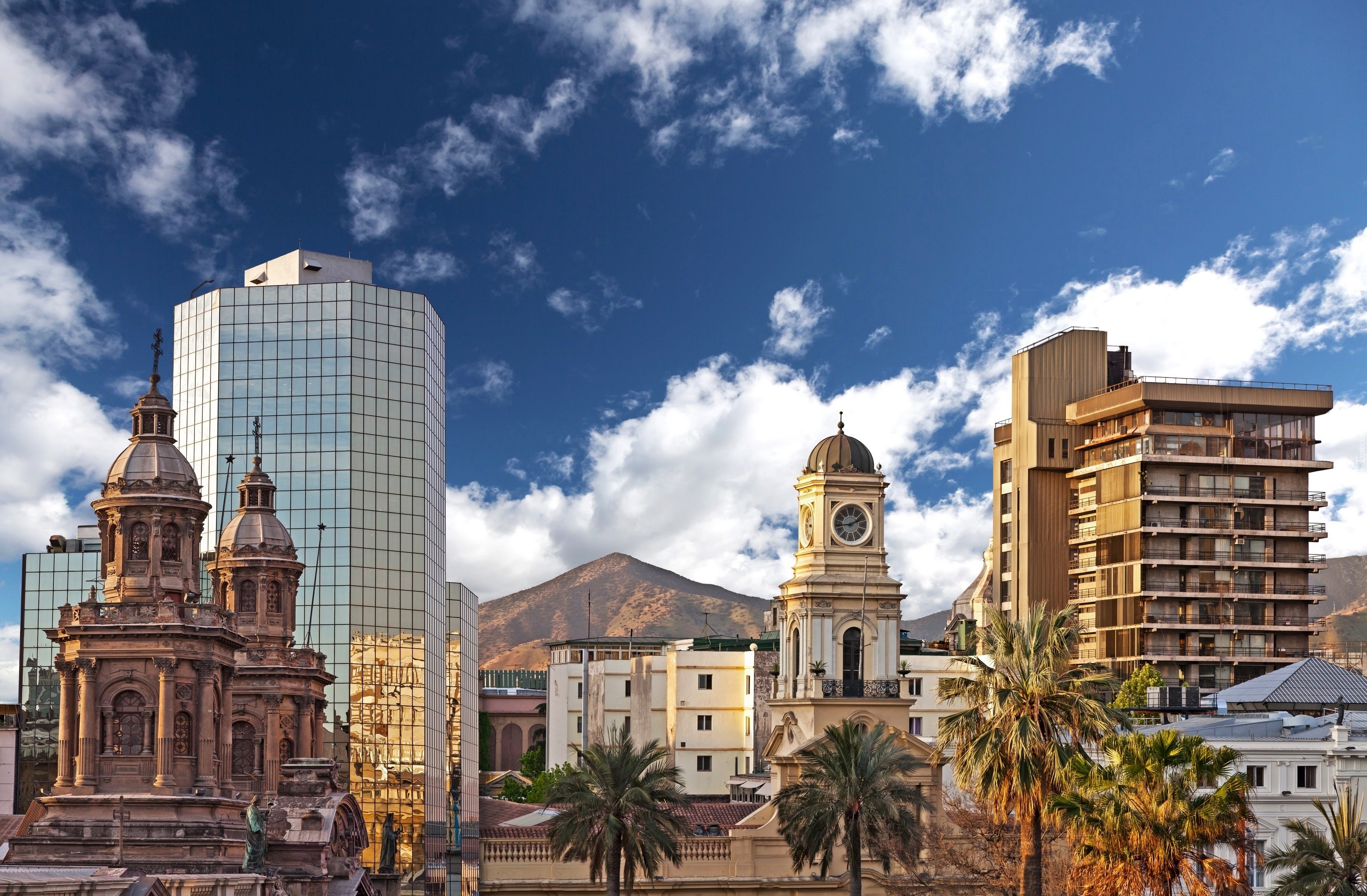 Edytor tapety: Miasto, Santiago, Chile, Budynki, Niebo, Góry