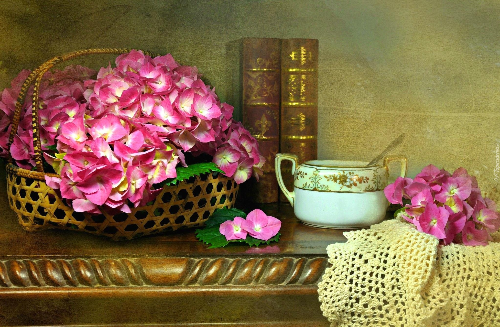 Edytor tapety: Hortensja, Koszyk, Książki, Kompozycja