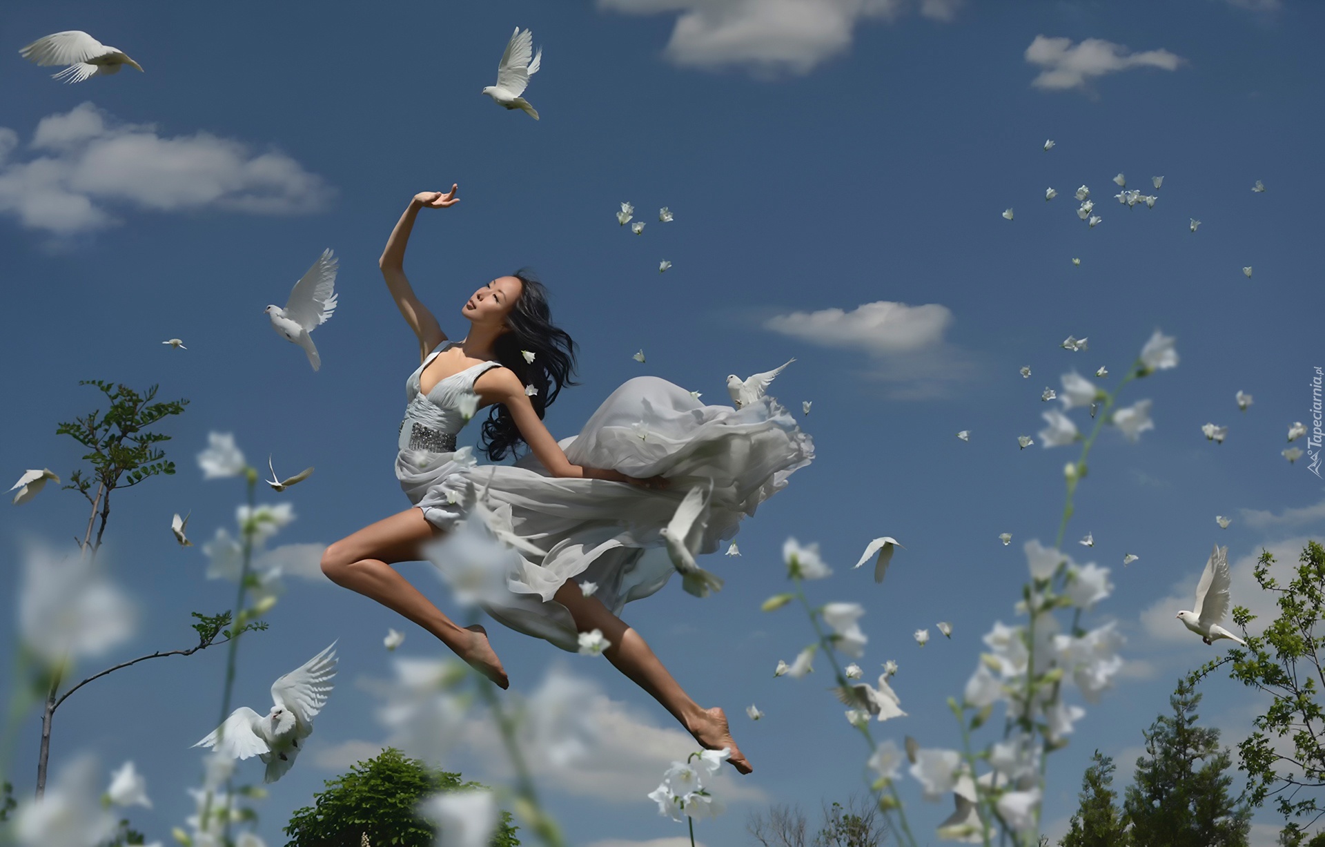 Edytor tapety: Dziewczyna, Biała, Sukienka, Niebo, Gołębie